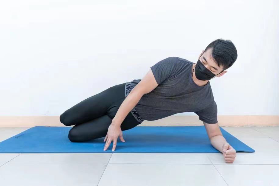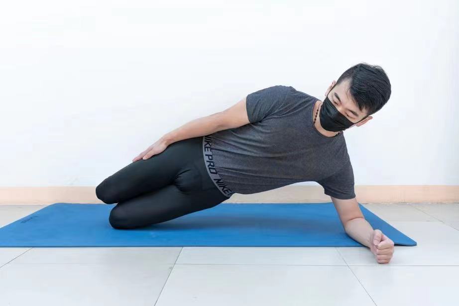 侧卧于地垫上,双膝屈曲,以左侧手肘将身体自然撑起,右手置于身体右侧,以左膝及左肘部为支撑,缓慢抬起臀部,感受左侧臀部及腹部侧方肌肉发力,注意保持身体平衡,不要前倾及后仰。保持5秒钟,缓慢放下,重复10次为一组。右侧同样。