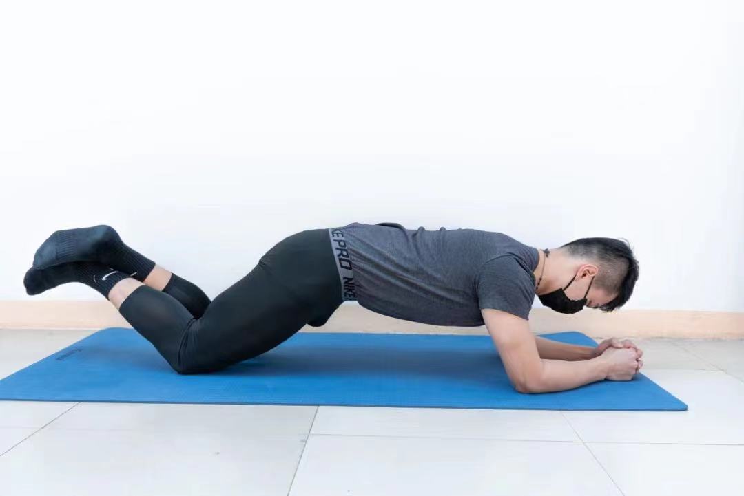 跪姿于地垫上,手肘撑地,调整位置,保持躯干与地面平行,注意不要耸肩和塌腰,腹部及腰背部肌肉同时发力以维持姿势,保持30s,休息15s,重复3-5次为一组。