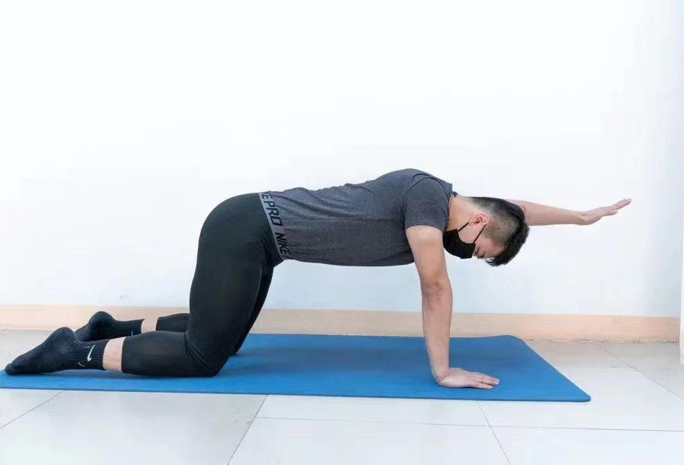 此动作为前两组动作的结合,需要较强的躯干稳定性。跪姿于地垫上,双脚自然分开,双手撑地,同样注意不要耸肩和塌腰,保持腹部收紧,腰背部肌肉发力,同时抬起左手及右腿,注意保持平衡,维持2秒钟后换边,如此交替20次为一组。