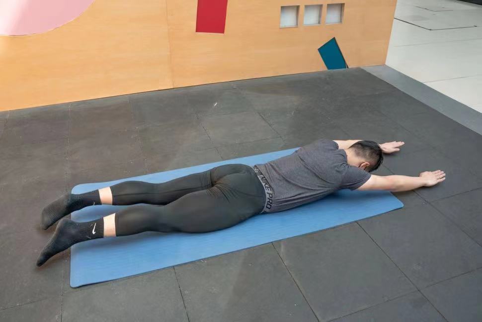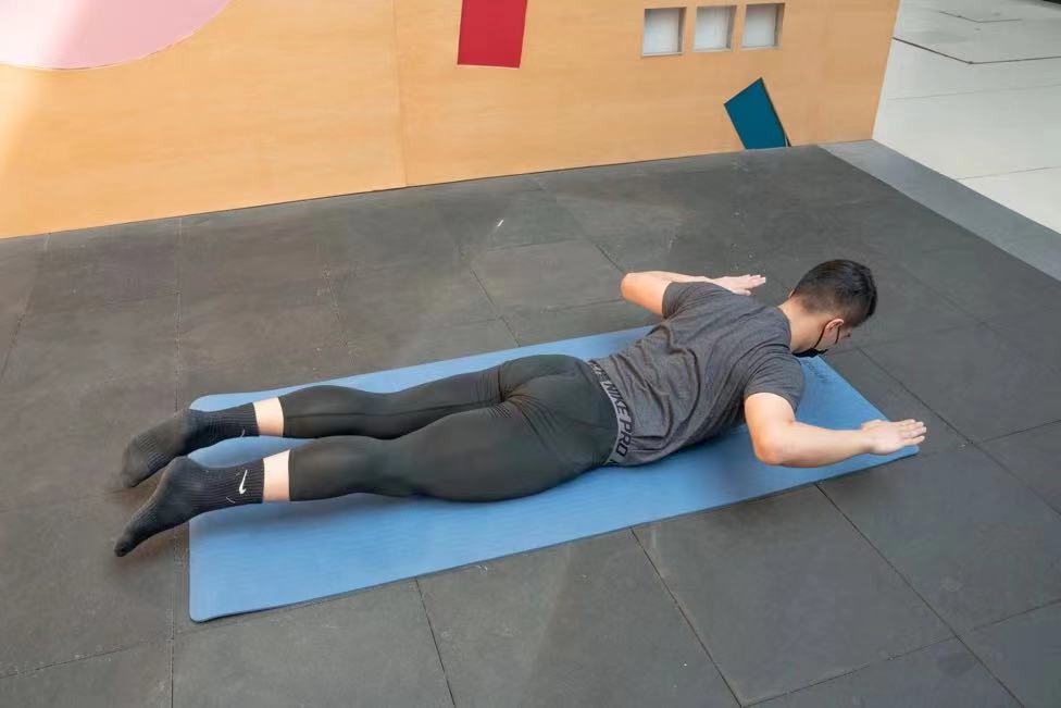 俯卧于地垫上,双脚自然分开,双手臂向前伸,然后向后屈肘,肩胛骨收紧,并带动上半身抬起,感受下腰背部肌肉发力,保持2-3秒钟后回到原来的姿势,重复20次为一组。