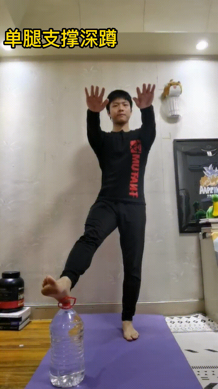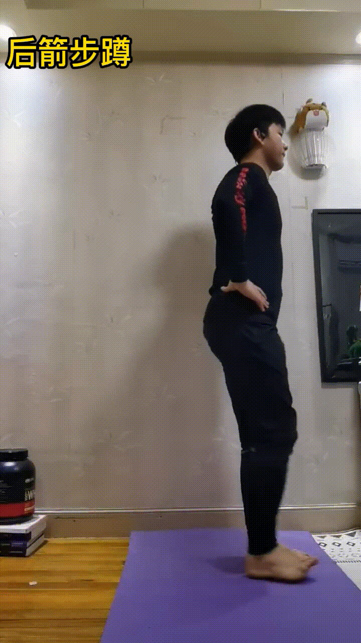 要点:身体站直,一只脚下方放一个30厘米左右的支撑物,距离身体一步远,脚后跟踩着支撑物,双腿前后分开与肩同宽,双臂向前,保持平衡,支撑腿屈髋屈膝,脚后跟起来停止下蹲。