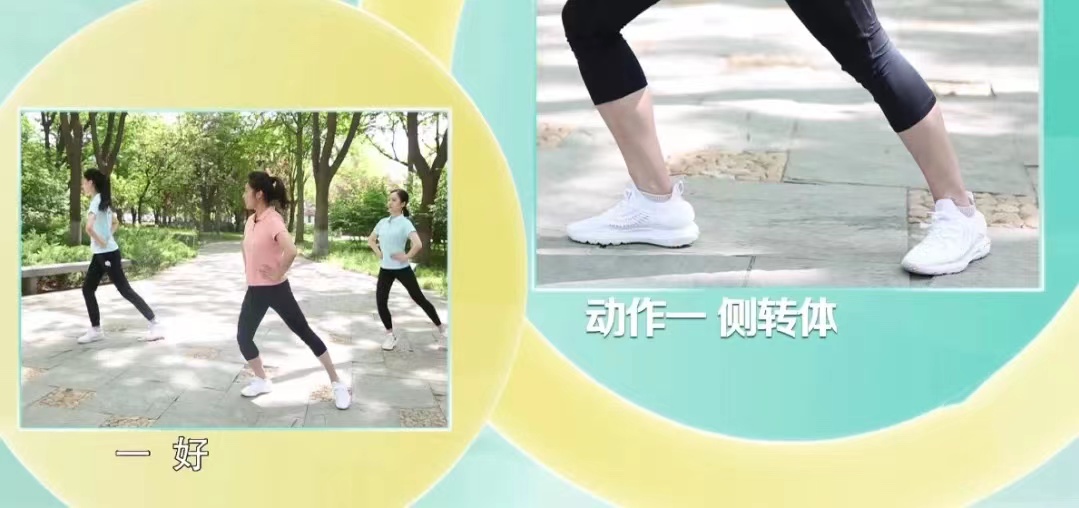 4.在完成手臂和脚下动作配合的时候,要增加一个向侧面的转体动作,然后还原到正面