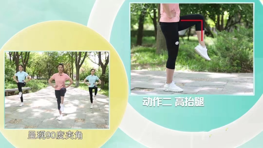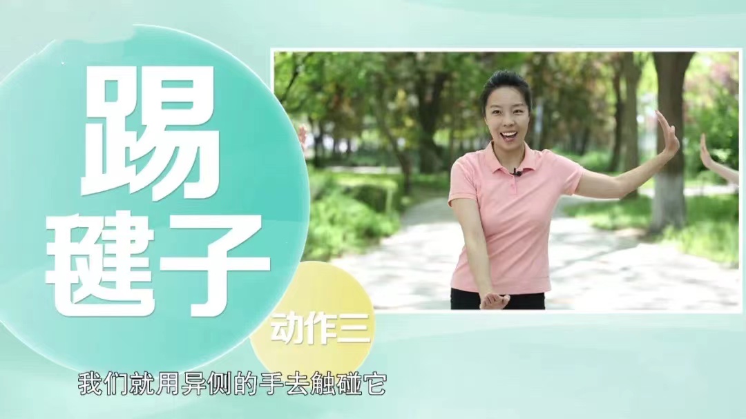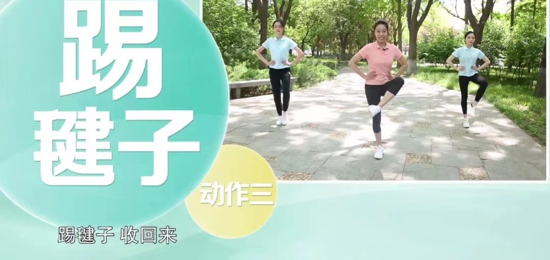 1.两手叉腰,做踢毽子的动作,左腿向内收,用足部主动向上,对髂腰肌、腹肌的侧面有强烈挤压感