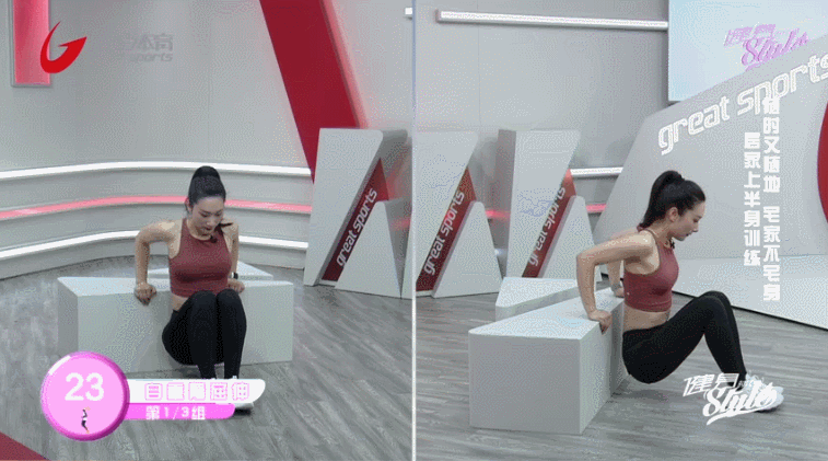这个动作主要是锻炼手臂后侧的肌肉,首先要找到一个距离地面有一定高度的地方,可以是床边、茶几等,然后将双手撑在支撑物上,双脚踩实使身体和臀部有一个夹角,主动使臀部靠近地面,然后推起回到原本的位置。该动作每次训练做3组,每组40秒,每做完一组间歇20秒休息。