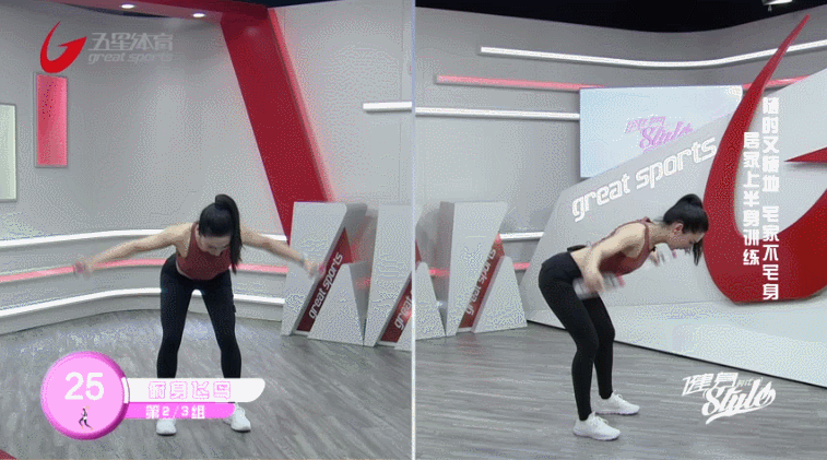 完成动作前需要准备两个矿泉水瓶,俯身飞鸟可以很好训练背部的肌肉。在做这个动作过程当中,需要收紧肩胛骨,尽可能用背部发力。该动作每次训练做3组,每组40秒,每做完一组间歇20秒休息。