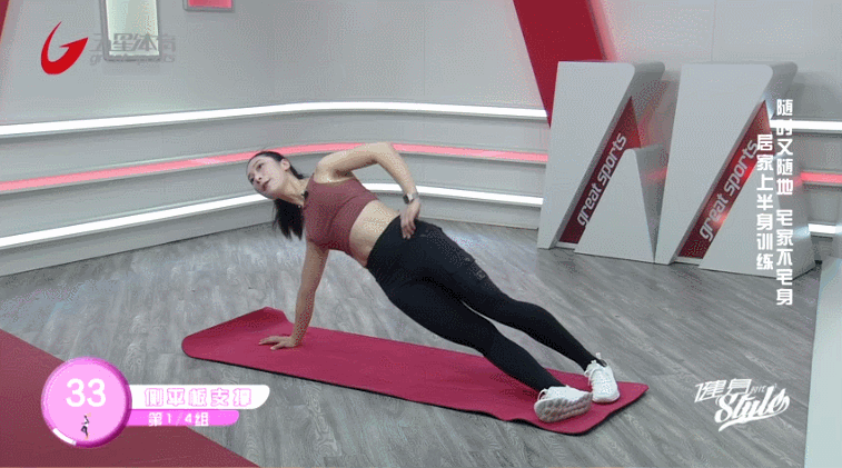 侧平板支撑是一个可以帮助训练侧腹的动作。只要一块瑜伽垫大小的地方,侧卧在垫子上就可以运动起来啦。如果力量不够,也可以撑在沙发上或是略微高点的地方。该动作每次训练做4组,每组40秒,每做完一组间歇20秒休息。