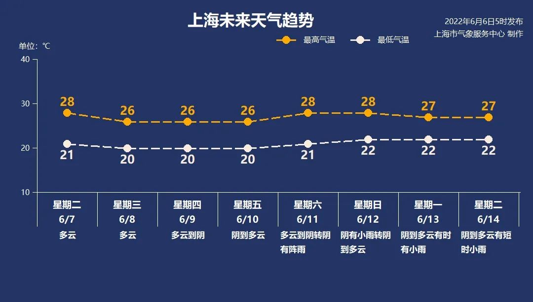 周二起气温进入平稳区间,最低气温20-21℃,最高气温26-28℃。周六开始会有一些阵雨侵扰,气温方面有小幅波动。