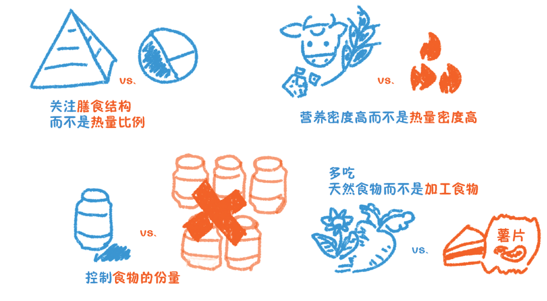 怎么吃是一个长期的习惯,很多食谱可以在短期内告诉你具体吃什么、吃多少,甚至可以做好了送到家门口,但是这种方法无法长期维持。大量的减肥研究告诉我们,能否长期坚持才是减肥成功的关键。所以只有认识到不同食物种类对于健康膳食的重要性,才能开始自我管理。长远来讲,制订适合自己口味和生活方式的食谱,是减肥成功的重要一环。