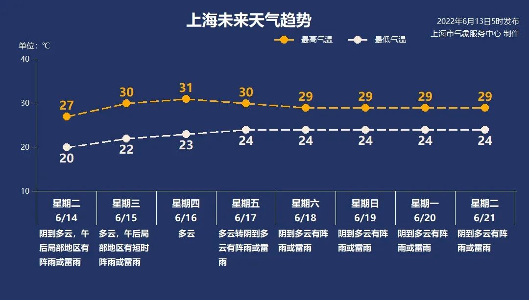 随着雨带南压,明天起上海将转为阴或多云天气,周二和周三午后会出现局部阵雨或雷雨天气。
