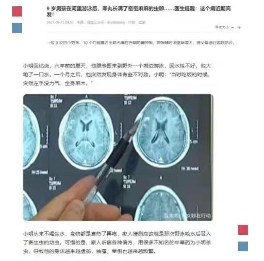 一小伙跟表哥到野外的一个湖边游泳,因不小心呛了一口水,之后经常会突然抽搐、晕倒,到医院检查发现脑里面出现了一条裂头蚴。还有9岁男孩在河里游泳后,睾丸里长了密密麻麻的血吸虫虫卵……?