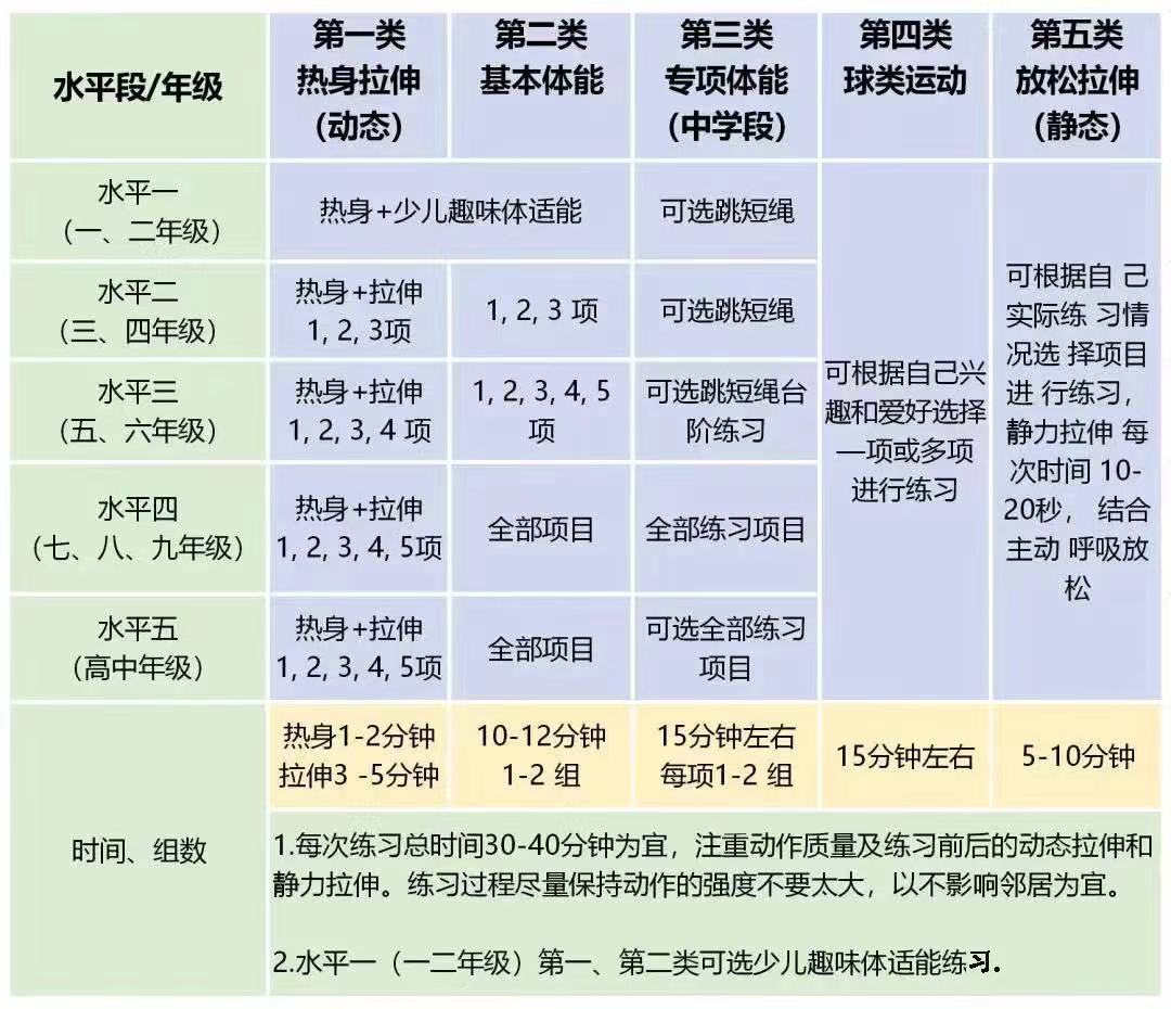 选择空旷地方开展活动,小学一年级练习30秒并脚跳短绳,小学二年级练习30秒并脚或单脚交换跳短绳,三至六年级练习1分钟单脚交换跳短绳,初中七至九年级练习1分30秒单脚交换跳短绳,高中年级练习2分钟单脚交换跳短绳。如无短绳可徒手空摇。