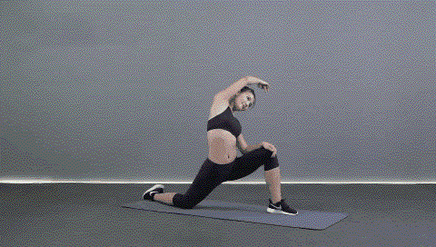 动作要点:挺胸收腹,前侧腿膝盖不要超过脚尖,后侧腿脚尖着地,与前侧腿脚尖方向一致;大腿与地面平行,小腿与地面垂直,充分伸展手臂。持续10-20秒,左右交替练习各2次。