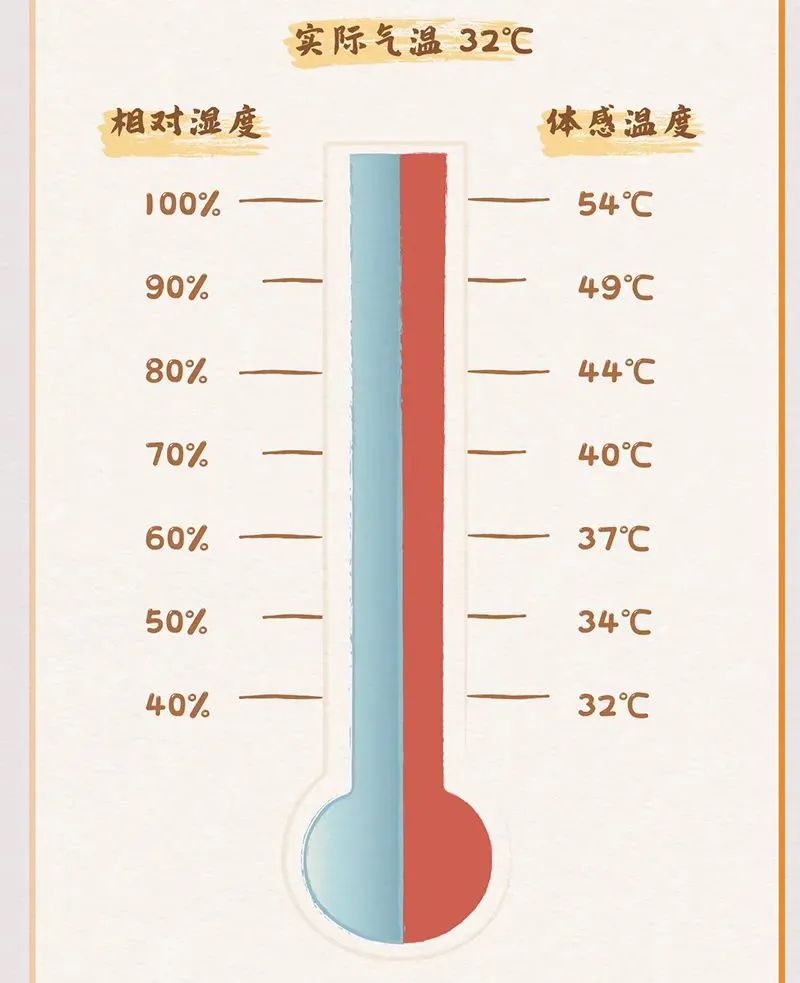当气温32℃、相对湿度达到60%时,体感温度就能达到37℃,体感温度还会随湿度升高而升高,相对湿度达到90%时,体感温度甚至能达到49℃。