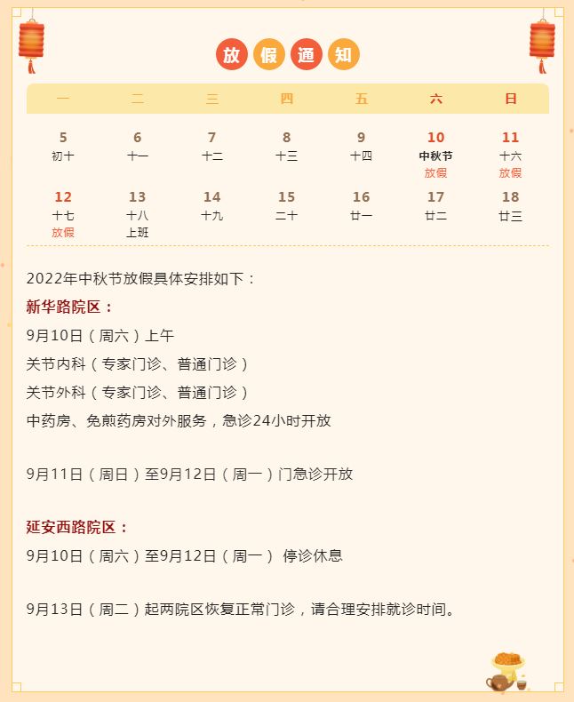 2022年“中秋”假期即将到来,笔者搜罗了本市三甲医院的门急诊放假安排,有备无患,请相互转告哦!