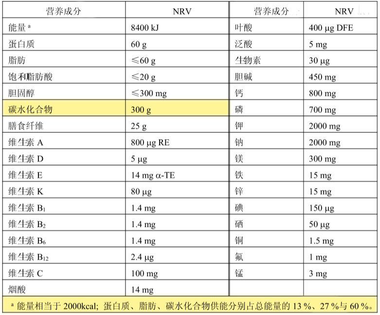 GB 28050-2011《食品安全国家标准 预包装食品营养标签通则》规定:膳食中碳水化合物应占能量的60%左右。即一天平均所需碳水化合物不少于300 g。