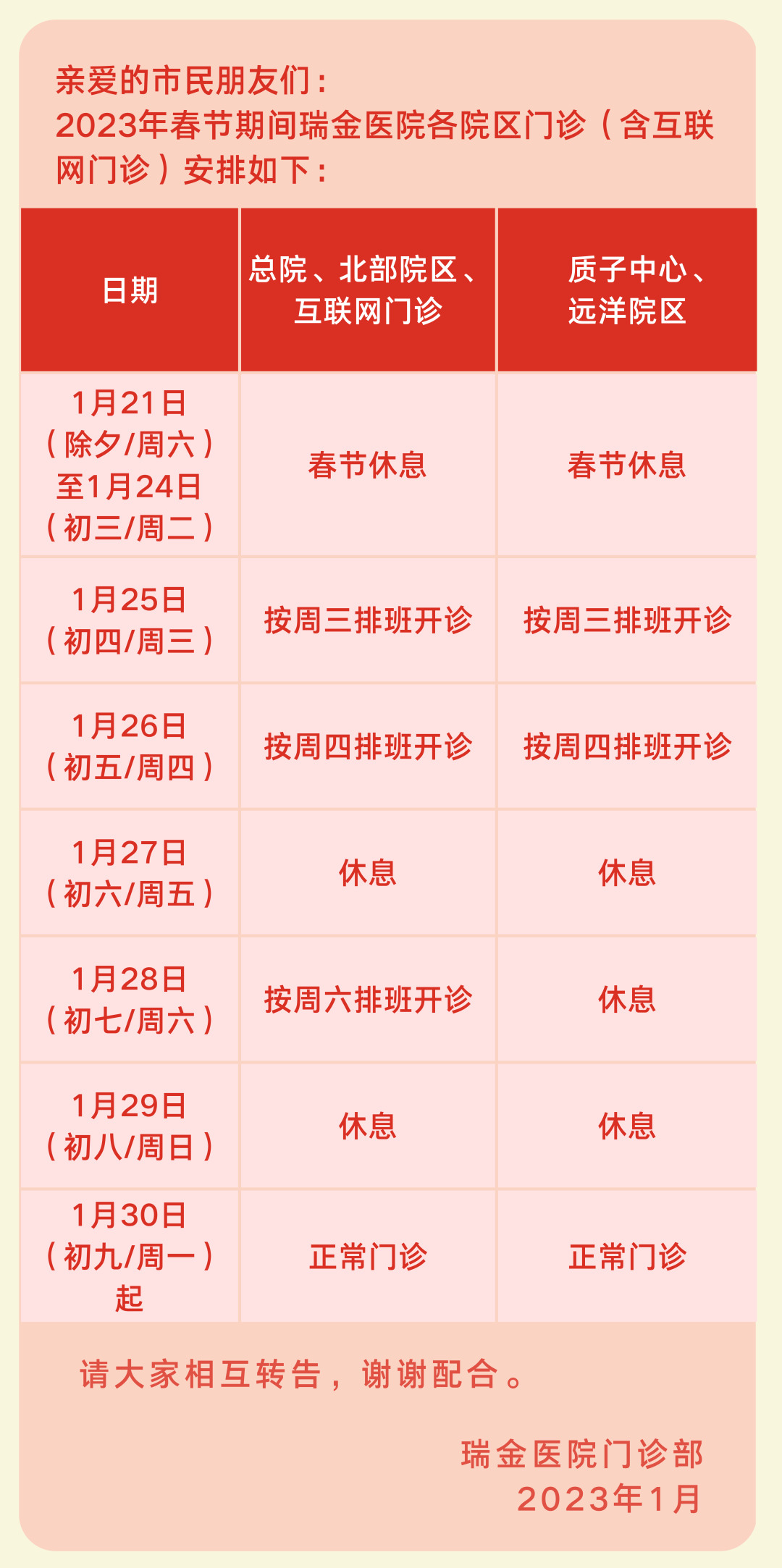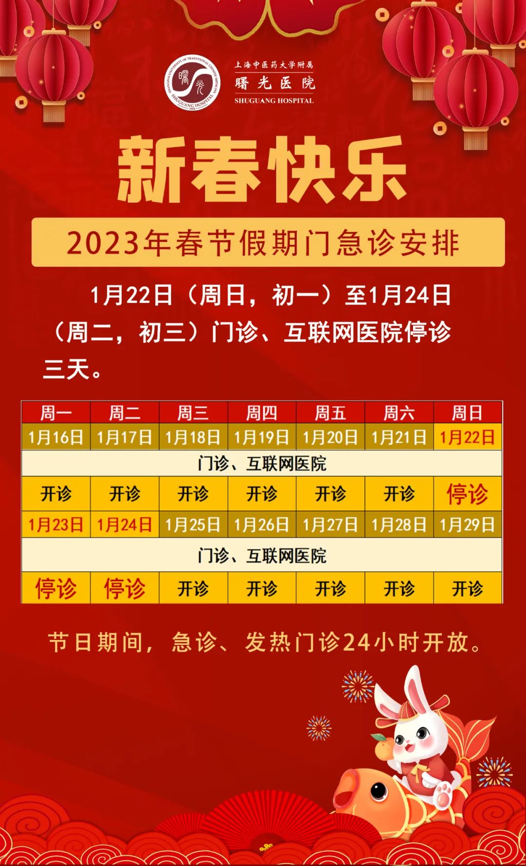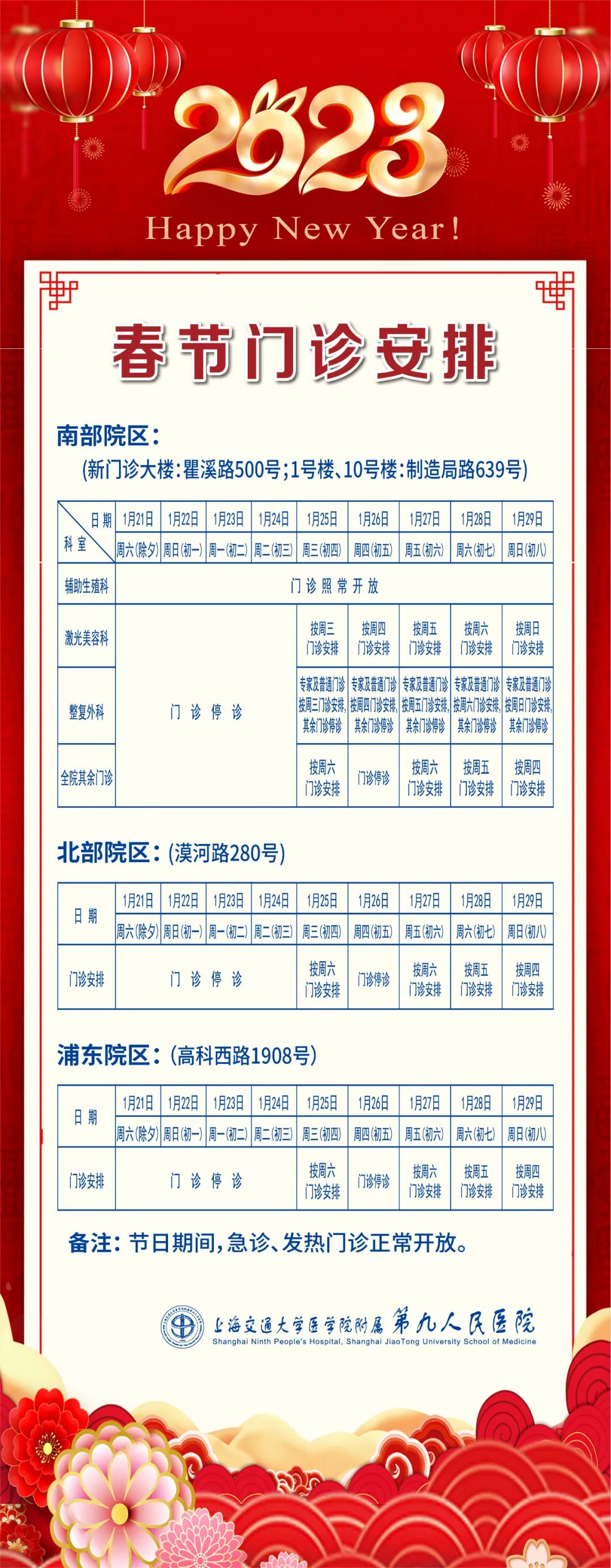 2023年“春节”假期即将到来,笔者搜罗了本市三甲医院的门急诊放假安排(部分医院假期安排待更新),有备无患,请相互转告哦!