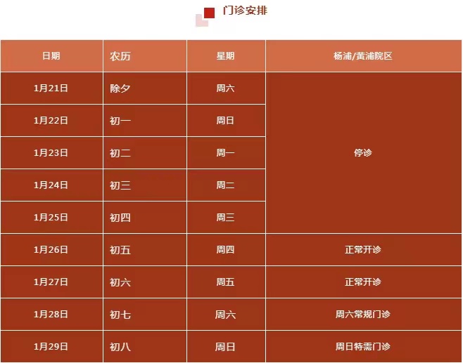 春节期间,黄浦院区与杨浦院区的发热门诊与急诊均为24小时开放,医院门诊就诊实行全预约制,患者需在预约成功后于预约时间段前来就诊。