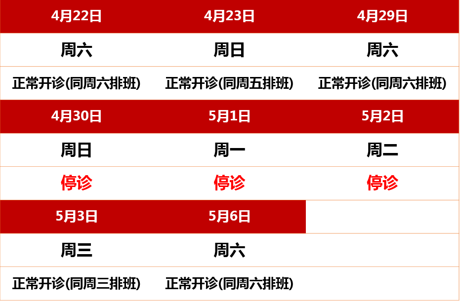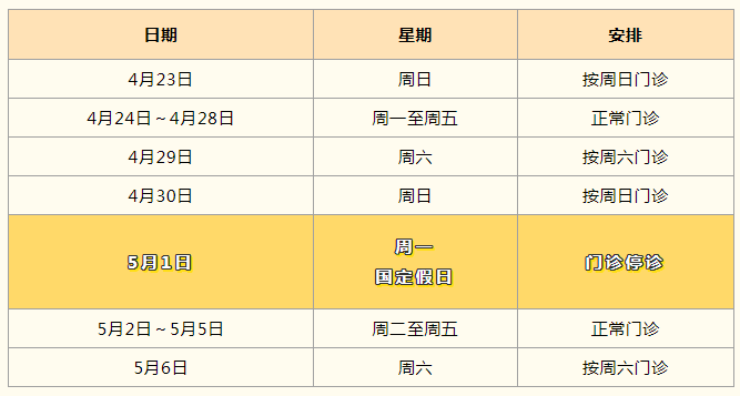 体检中心:4月23日正常上班,4月29日-5月3日休息。