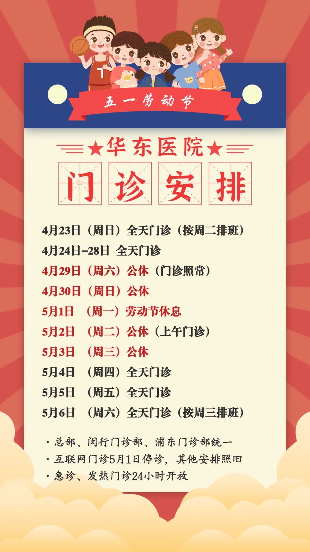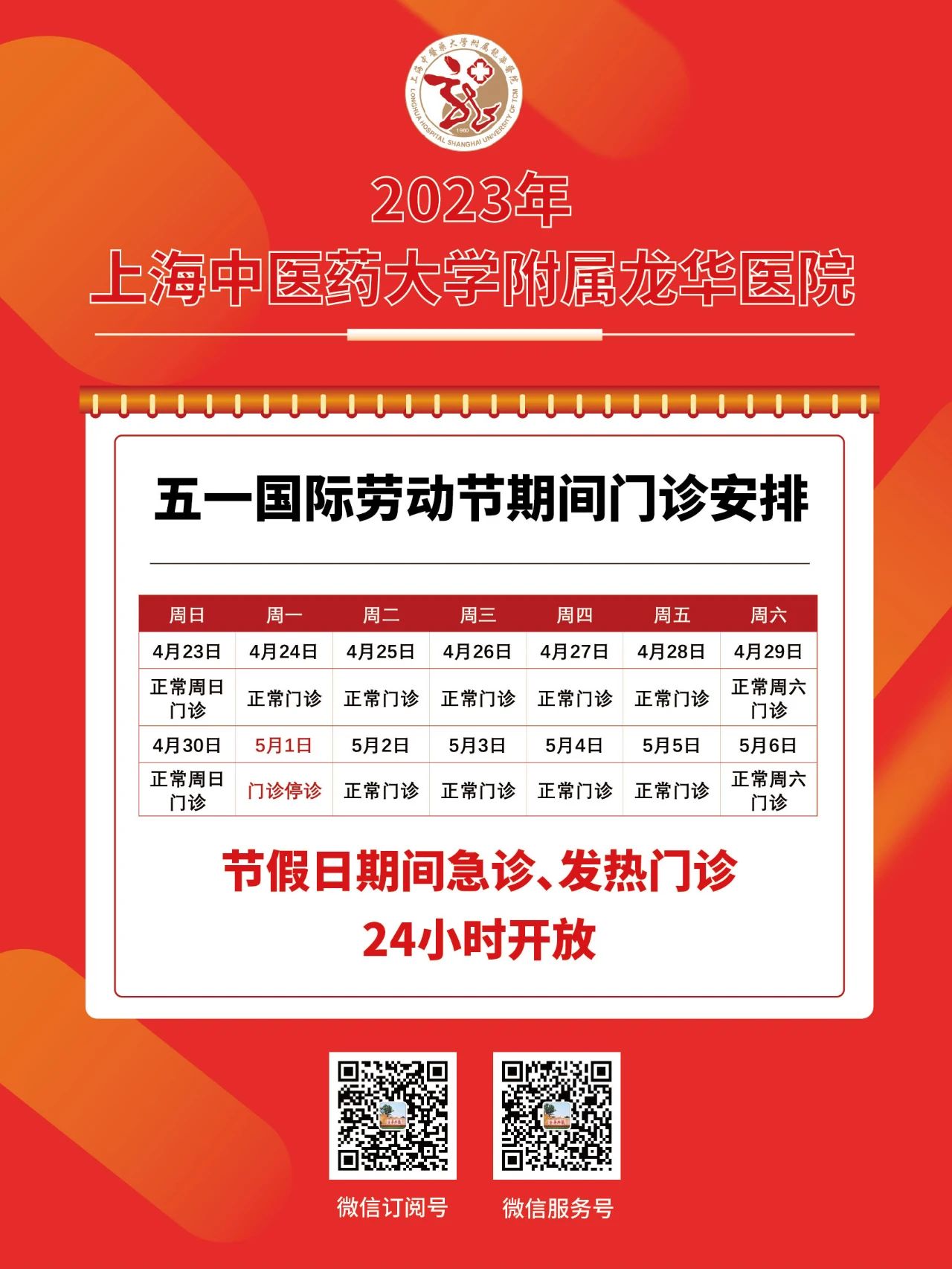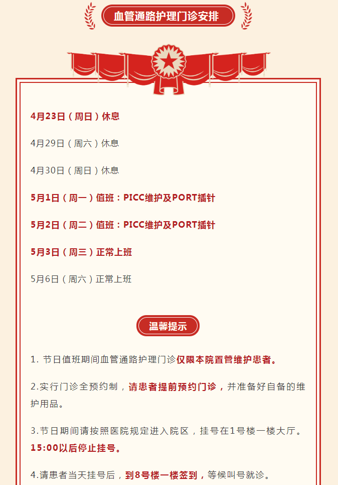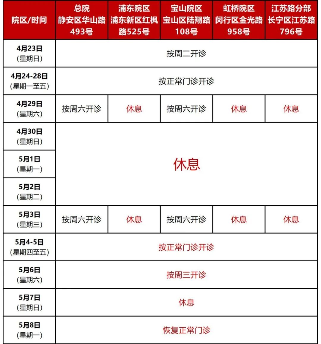 五一劳动节期间,各院区开诊科室根据患者就医需求动态调整,请提前关注“复旦大学附属华山医院”微信公众号,分院区、分时段查询出诊情况。