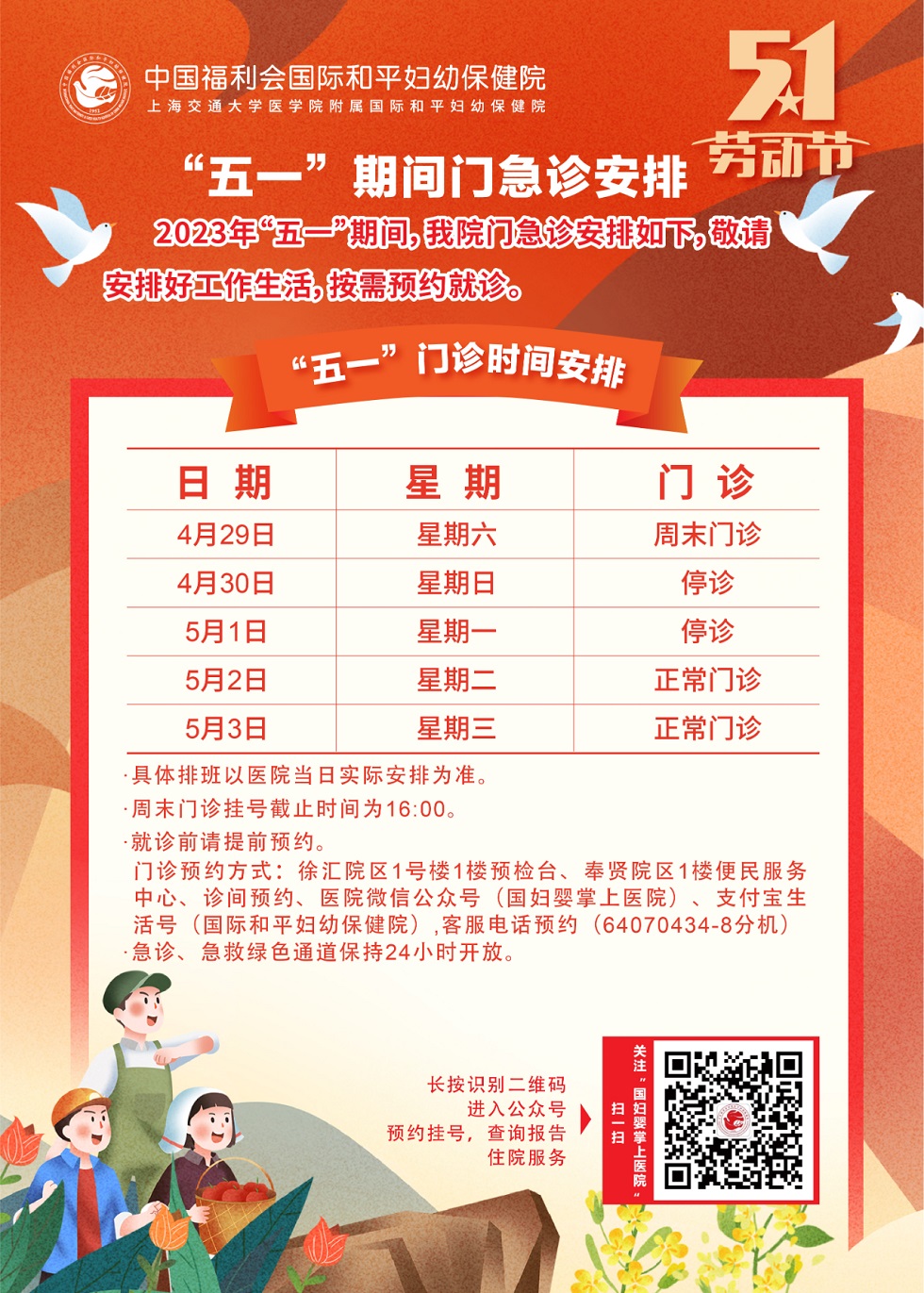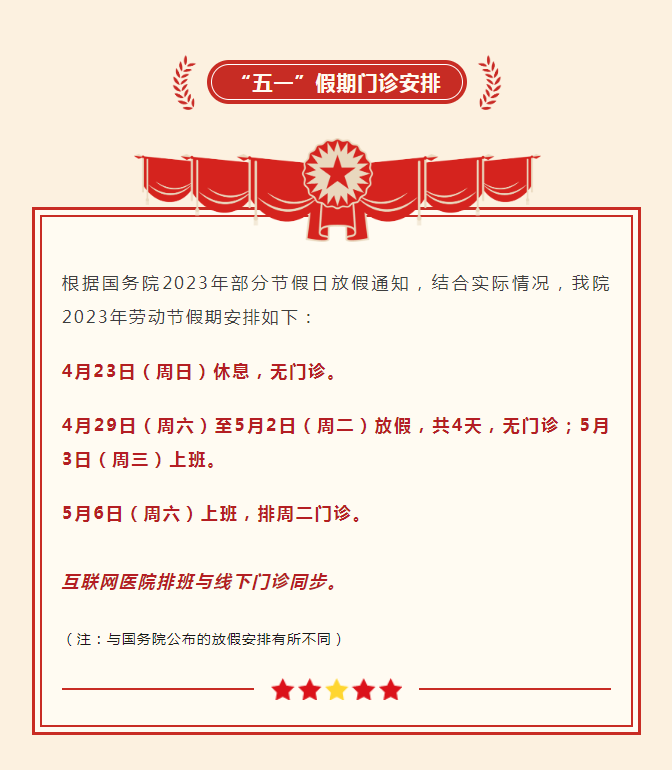 生殖中心:4月23日正常上班,4月29日-5月3日上午开诊、下午休息。