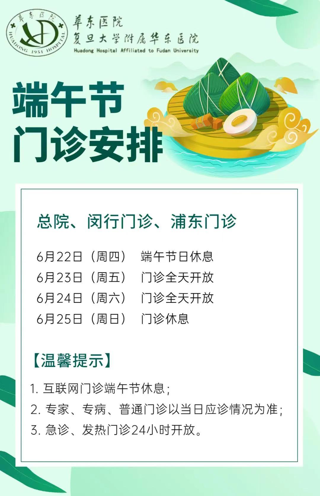 端午节期间,各院区开诊科室根据患者就医需求动态调整,请提前关注“复旦大学附属华山医院”微信公众号,分院区、分时段查询出诊情况,点击专家/科室/专病名称即可一键在线预约。
