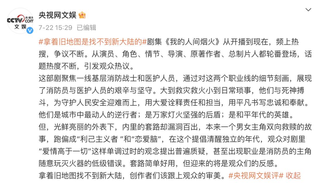 7月22日,@央视网文娱 评论该剧称,拿着旧地图找不到新大陆,创作者们该跟上观众的审美。