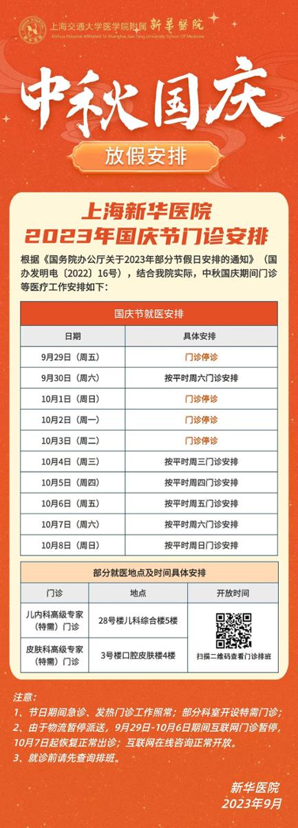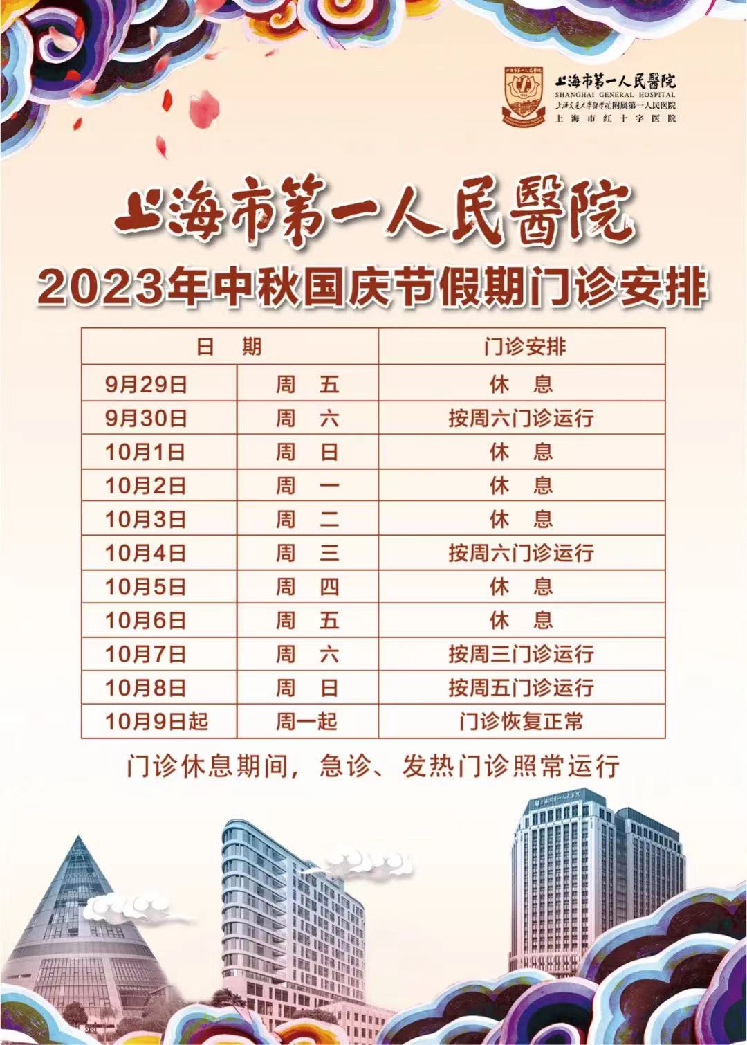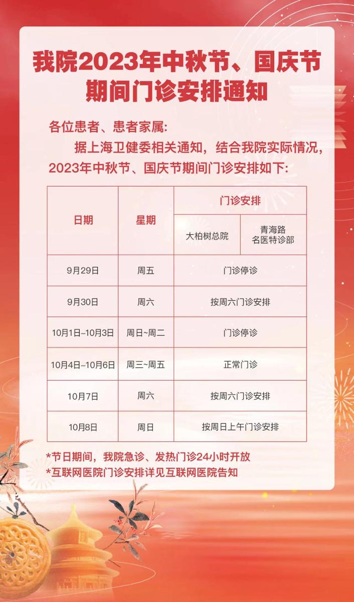 摘要: 2023年中秋、国庆“双节”将至,杨浦区、虹口区部分三甲医院的门急诊放假安排如下,有备无患,请相互转告!
