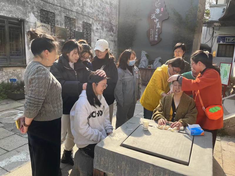 新场古镇和江浙古镇正在联合申报“世界文化遗产”。上海市中医文献馆依托“方氏针灸”和“蔡氏妇科”两项市级非遗,在新场海派中医基地内积极开展中医药非遗体验活动。蔡氏妇科纂香体验和方氏针灸的护眼操教学课程,不但受到古镇居民热捧,还助力新场健康旅游。线上的中医文化导赏课程也深受中医爱好者追捧。“小白读经典”系列读书会,由中医药专家在直播平台上领读中医经典书籍如《黄帝内经》,每期线上参与人数都超过100人。一月一次的中医科普直播,聚焦热点话题如“甲流的中医防治”“中医与AI”“奶茶铺与中医茶饮”等,引人关注。