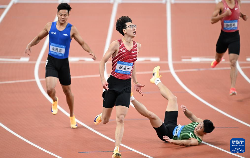 眼镜飞人徐卓一冲过终点,他接过刘翔、谢文骏的接力棒,创造了上海在男子110米栏项目九连冠的辉煌纪录。新华社图