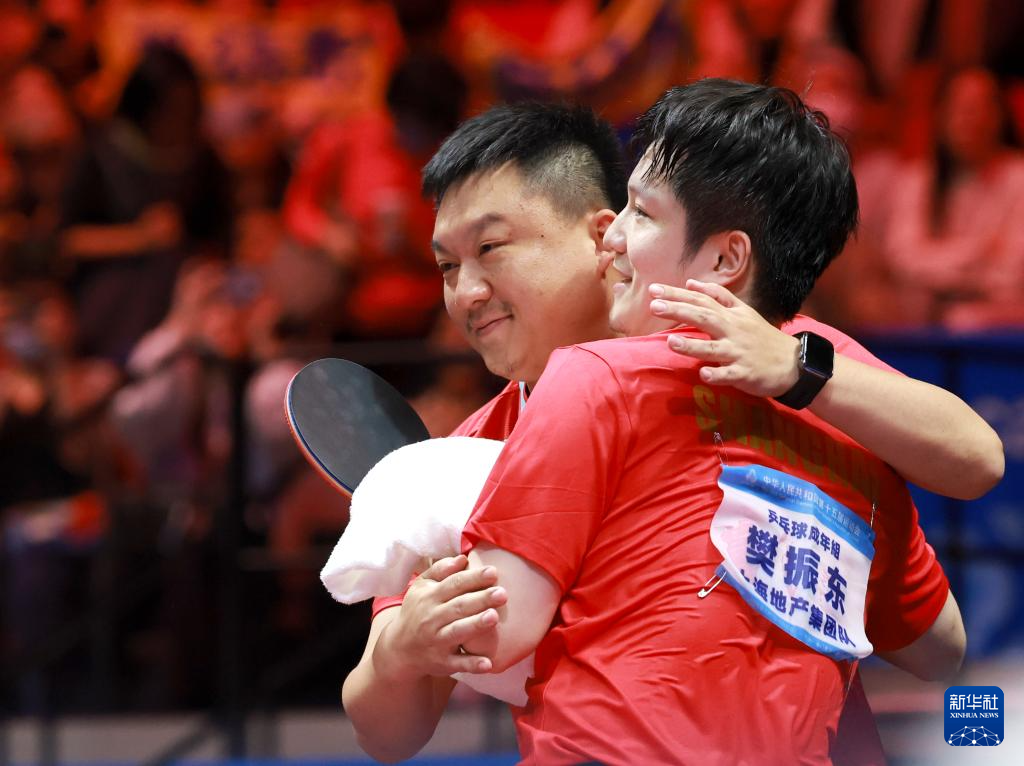 樊振东和上海队教练相拥。新华社图