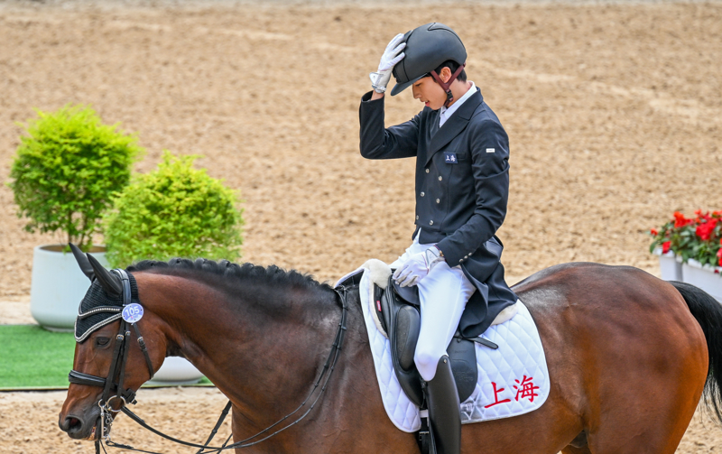 本次比赛评分由E点、M点、H点、C点和B点的五个点位裁判根据骑手和马匹完成动作质量进行打分,动作完成质量越高,得分越高。比赛中,上海队展现出极强的战术配合与团队稳定性:17岁的小将徐墨菲表现尤为亮眼,第一个出场的她与搭档“好好”,以69.294分的个人成绩位列所有参赛选手中的首位;第二棒20岁的吴悦、第三棒17岁的顾展兆延续良好状态,均交出高质量答卷;最后一棒,27岁的饶嘉怡与马匹 “藏羚” 顶住压力,以零失误表现完成全部动作,为团队锁定胜局。