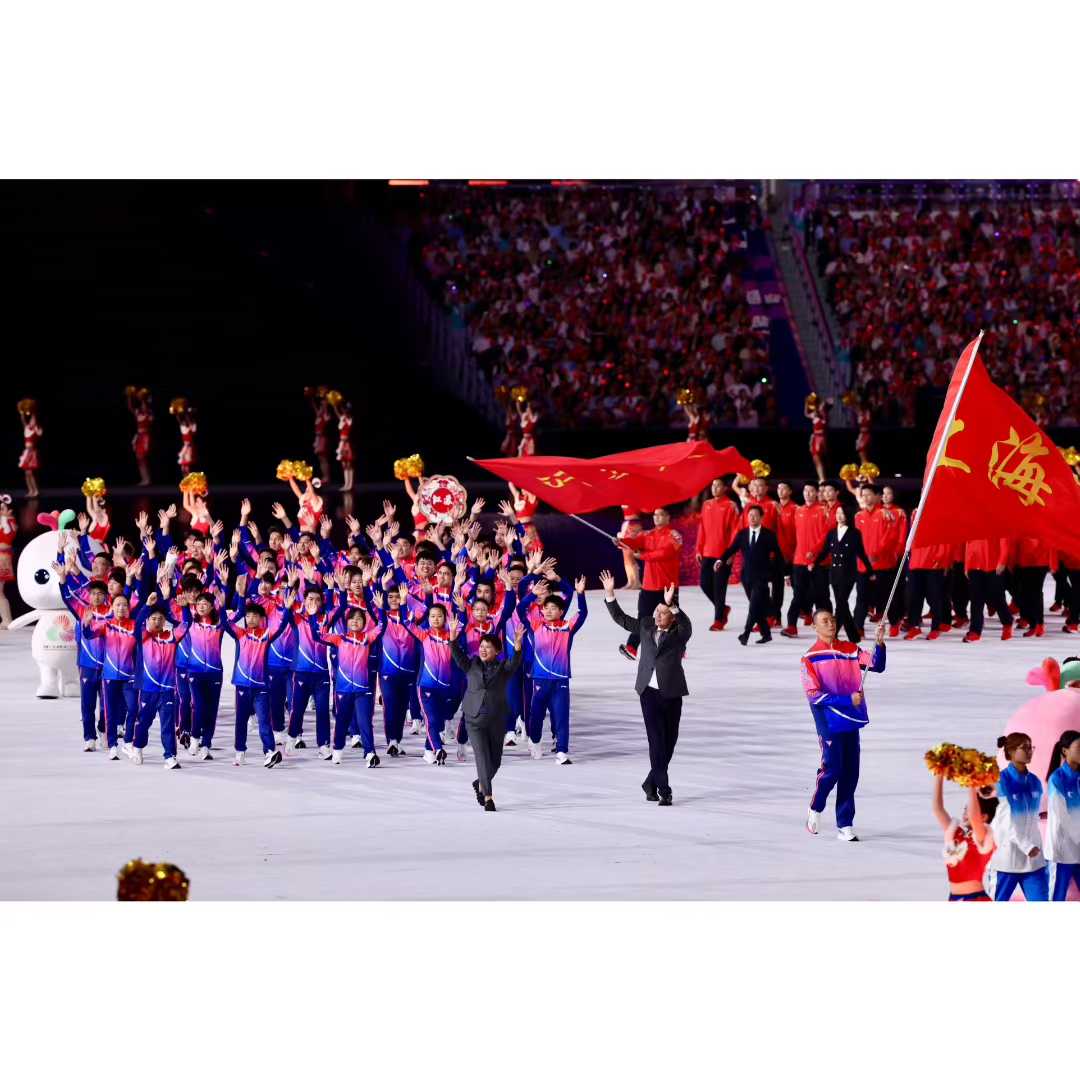 上海市代表团由拥有八届全运会参赛履历的男子水球选手余利君引领入场。在八届全运会中,余利君夺得四金四银。上海市代表团打破常规,选择一名老将担任旗手,一方面是对这位老将的致敬,另一方面则是希望老将的拼搏和坚持能够感染和带动更多年轻运动员和中生代运动员。