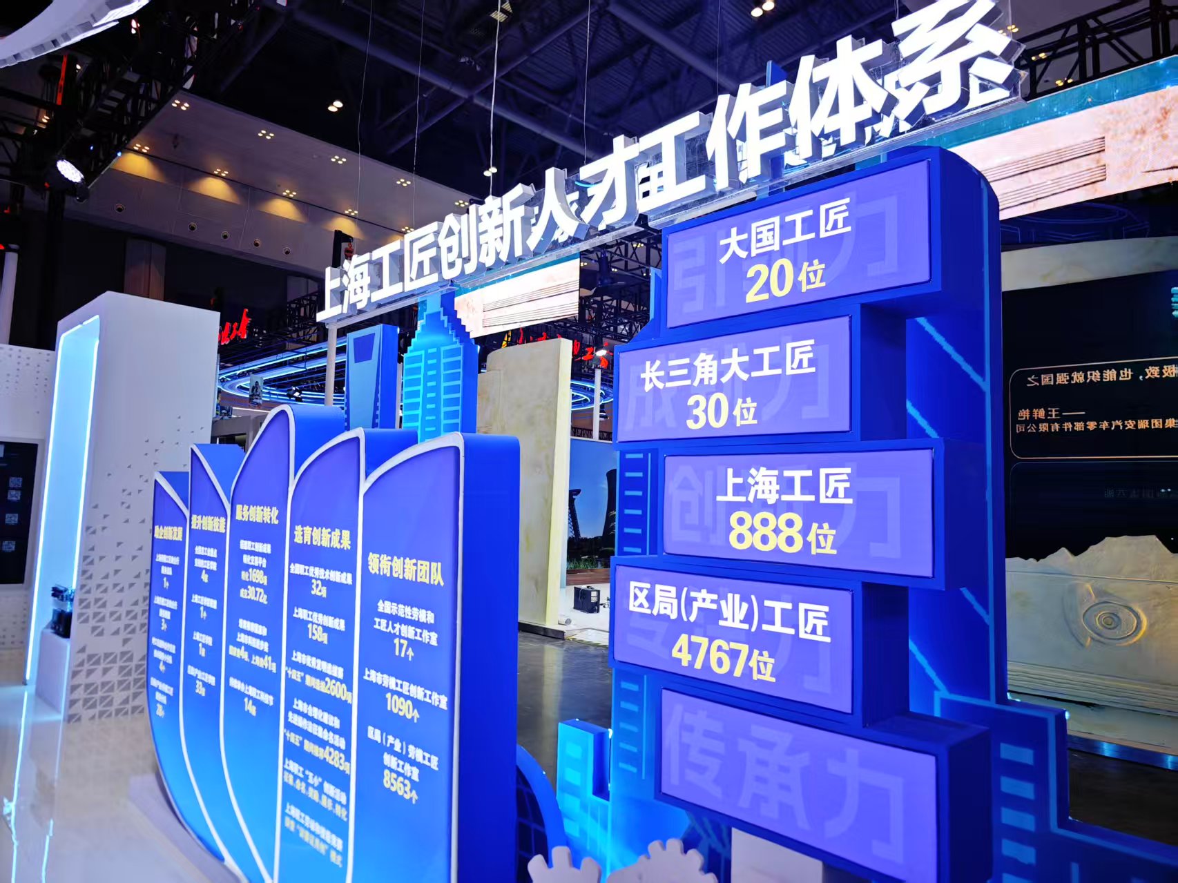步入上海展区,首先引入眼帘的是上海工匠创新人才工作体系的“白玉兰”,该图谱绘制了上海当前培育工匠人才的体系矩阵,包括工匠人才培育阶梯体系、工匠人才培训阵地体系、工匠人才创新团队体系、工匠人才创新服务体系和工匠人才助企组织体系。目前,上海已诞生20位大国工匠,30位长三角大工匠,888位上海工匠,4767位区局(产业)工匠。值得一提的是,不少工匠人才此次也携创新成果来到大会现场,观众有机会与他们面对面交流。