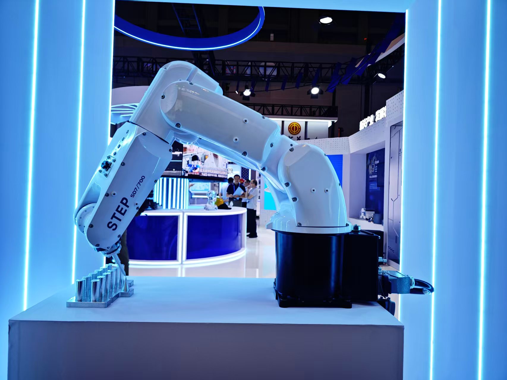 “新兴产业发展壮大”区域主要聚焦人工智能、集成电路、生物医药三大先导产业,展示上海工匠人才创新成果,共有18件展品,包含BOX型裸眼3D影片、工业机器人精准动态展示、芯片制造全流程实物展品、生物医药组合互动屏。上海工匠、上海新时达电气股份有限公司企业技术中心主任陈伟带来的一项技术被誉为机器人“帕金森症”专科“医生”,通过研发出低频抖动抑制技术,使机器人运行更平稳,精度更高,工作效率提升了近30%,且位置稳定时间指标达到国际先进水平。