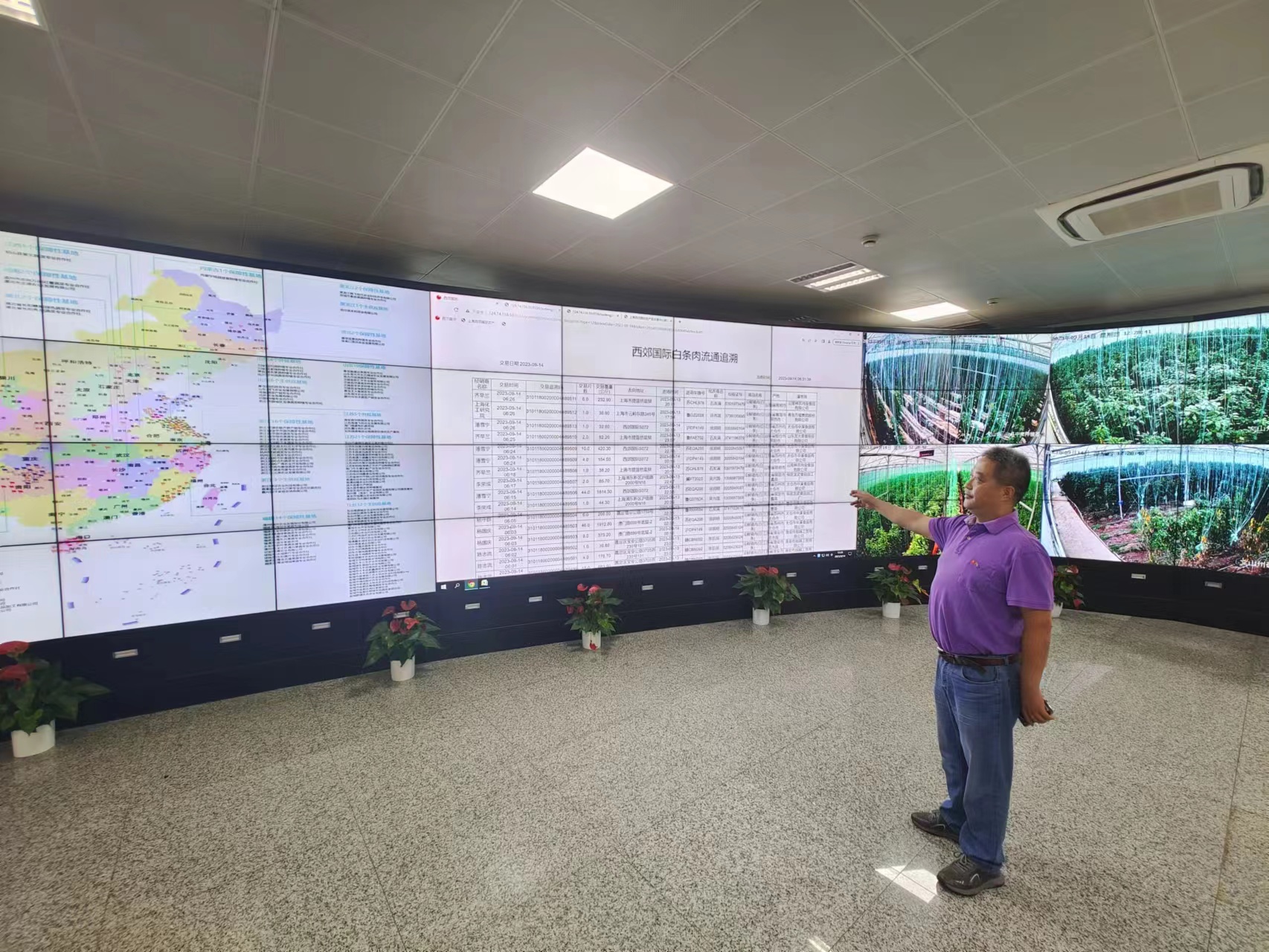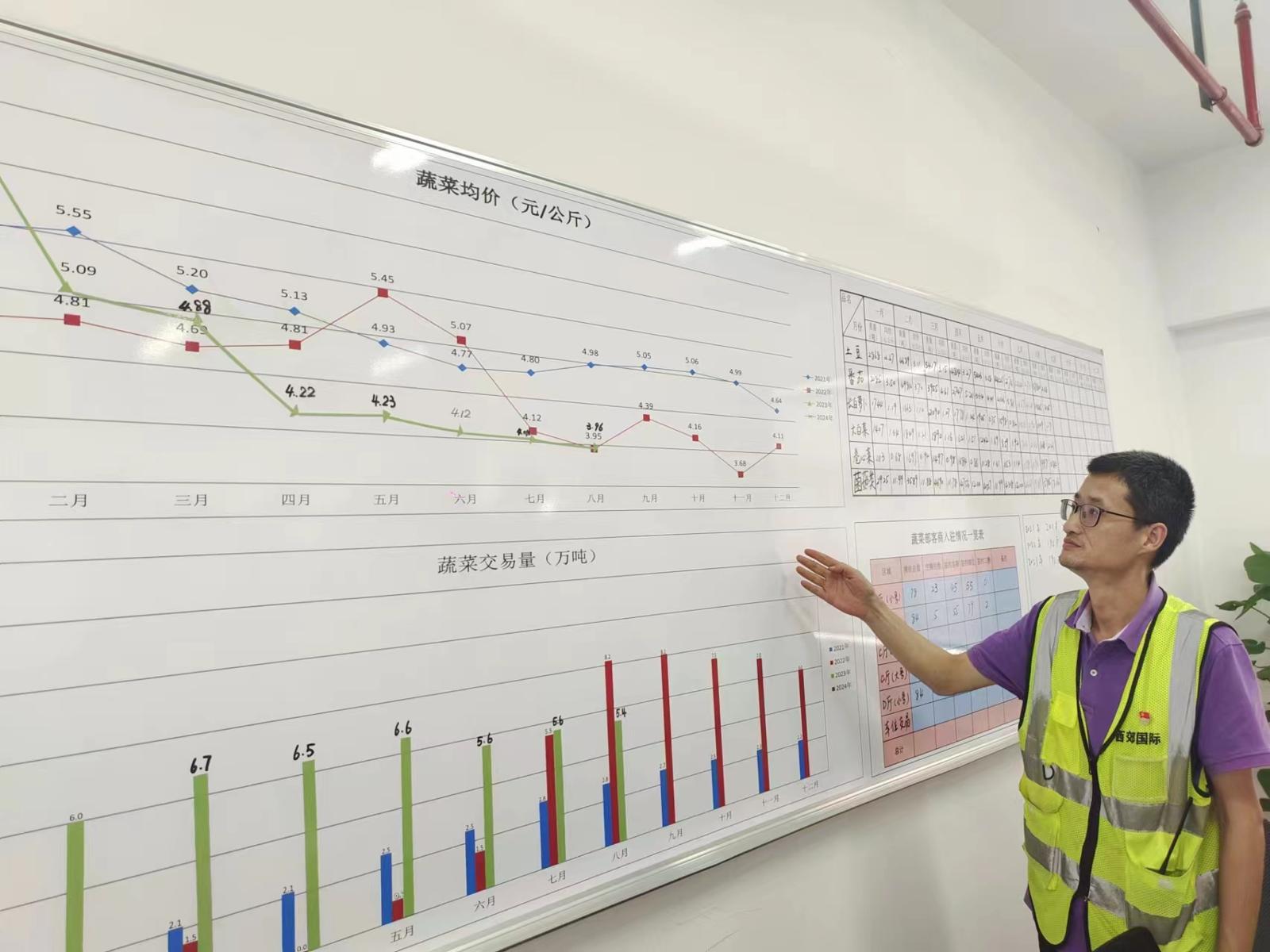 在西郊国际办公楼区域里,藏着一块由96块显示屏组成的巨大屏幕。实现了对市场内外全程监控、实时公布市场“果菜肉”平均价格,和对直供基地远程把关的多项功能。