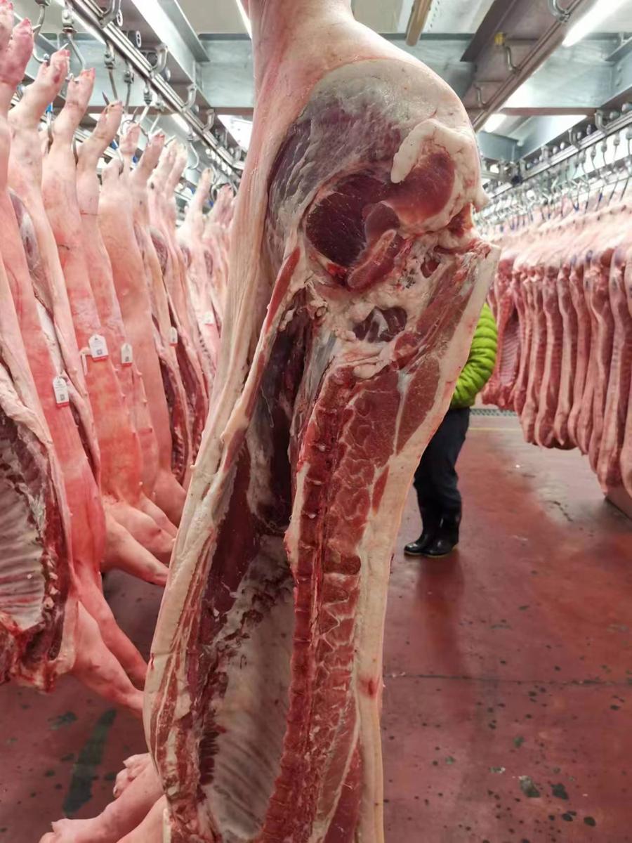“在这里,平均每天的猪肉供应量在5000至6000头,对半切割后也就是10000至12000片。我们自建了一套预登记系统,每一片猪肉都需要溯源并录入信息。每晚从20时开始,到凌晨4点左右是最忙碌的时刻,陆陆续续到清晨7点多仍在不间断地忙碌。”西郊国际肉类部副经理瞿卫东说,而除了高温天穿羽绒服上夜班外,在岗时,还需要通过“火眼金睛”剔除不合格品。