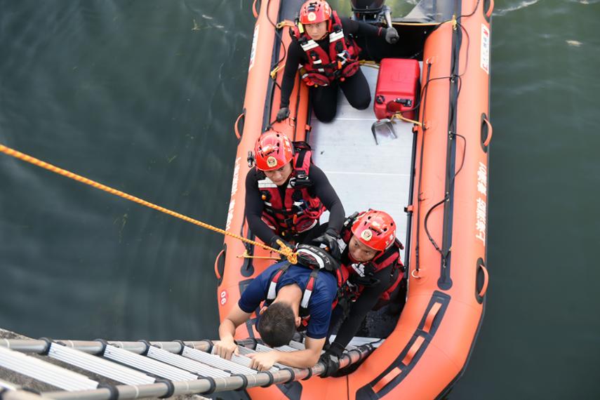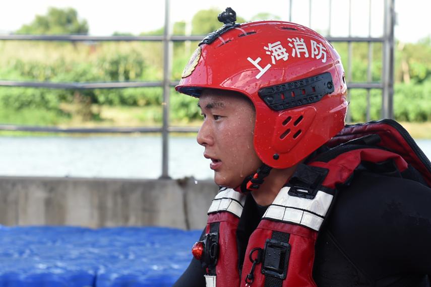 青浦区朱家角古镇,水域丰富,紧靠淀山湖,水域面积是陆地面积的两倍之多。在这样的地形环境下,全上海唯一拥有站内水上码头的消防救援站就在朱家角。从这里的码头出发,救援队员登上冲锋舟,可以在7分钟内抵达古镇的任何水域实行救援工作。作为朱家角消防救援站特勤分队副分队长,曾洋成每天都在训练水上救援队伍。记者前去采访的当天,顶着烈日的他们,全身穿着潜水服和救援背心,在水中,在舟上完成不同的训练科目。上岸时,曾洋成擦着脸,早已分不清是汗水还是湖水。