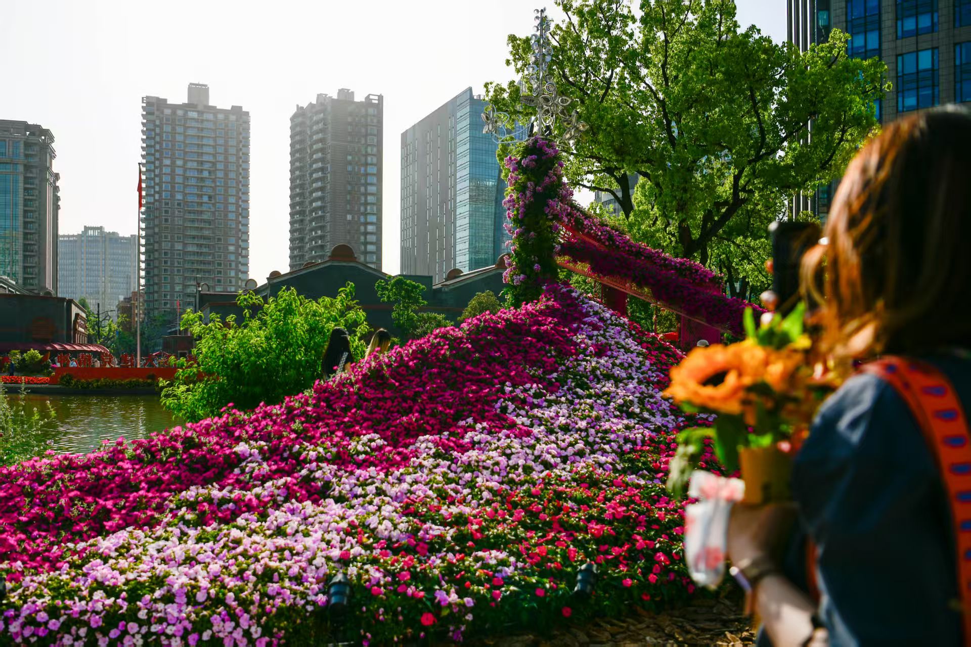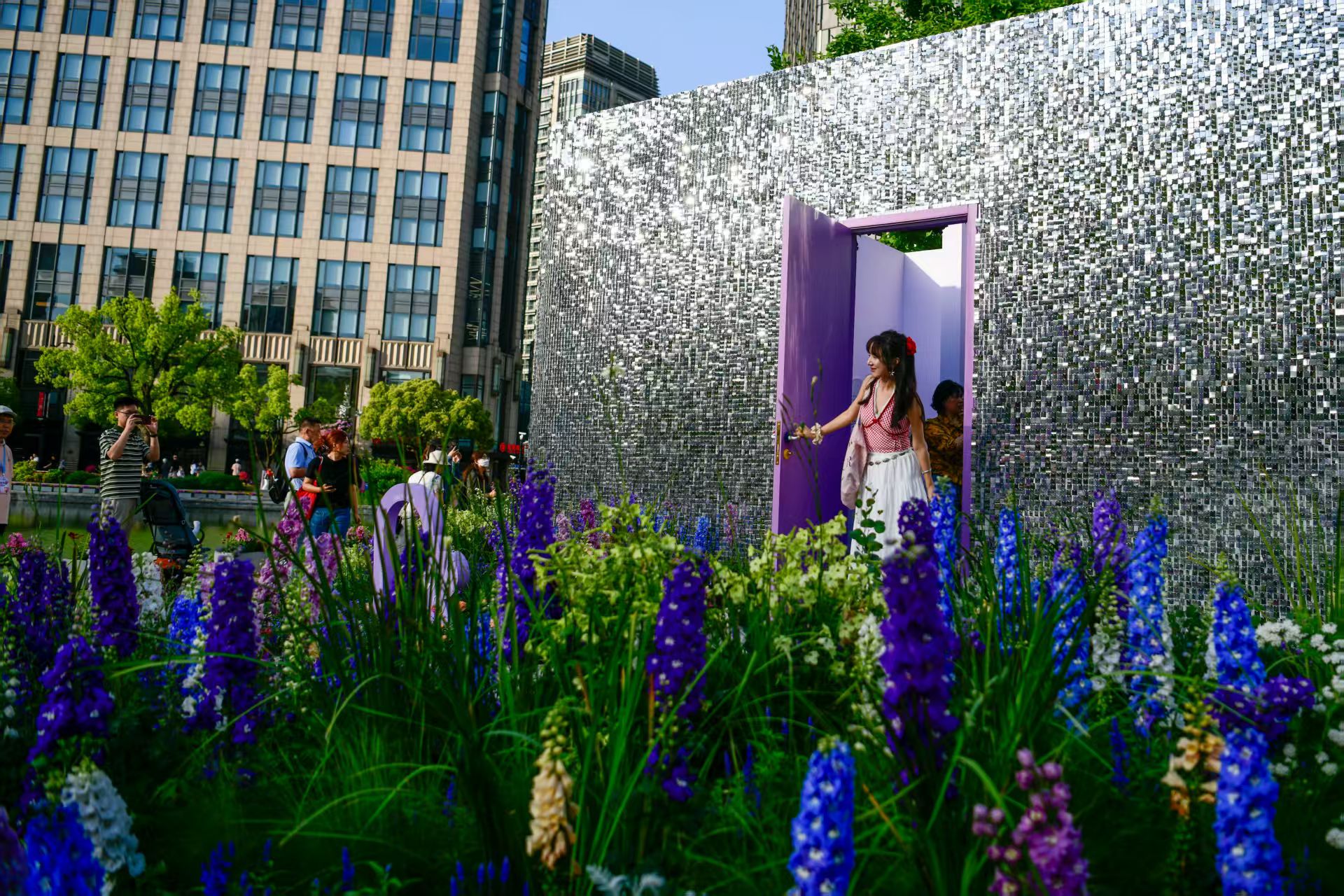 展览花境与申城地标融合,成为独特景观。劳动报记者 颜筱依 摄影