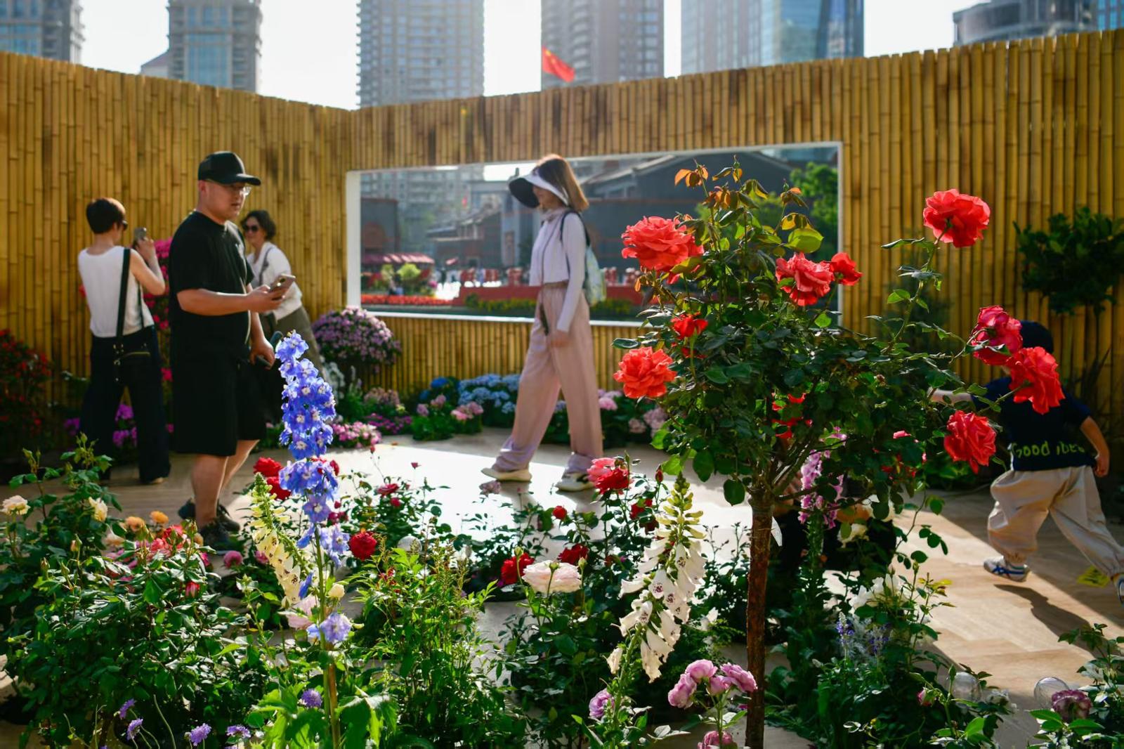 头图为市民在黄浦新天地太平桥绿地区域花展展陈前自拍合影。劳动报记者 颜筱依 摄影