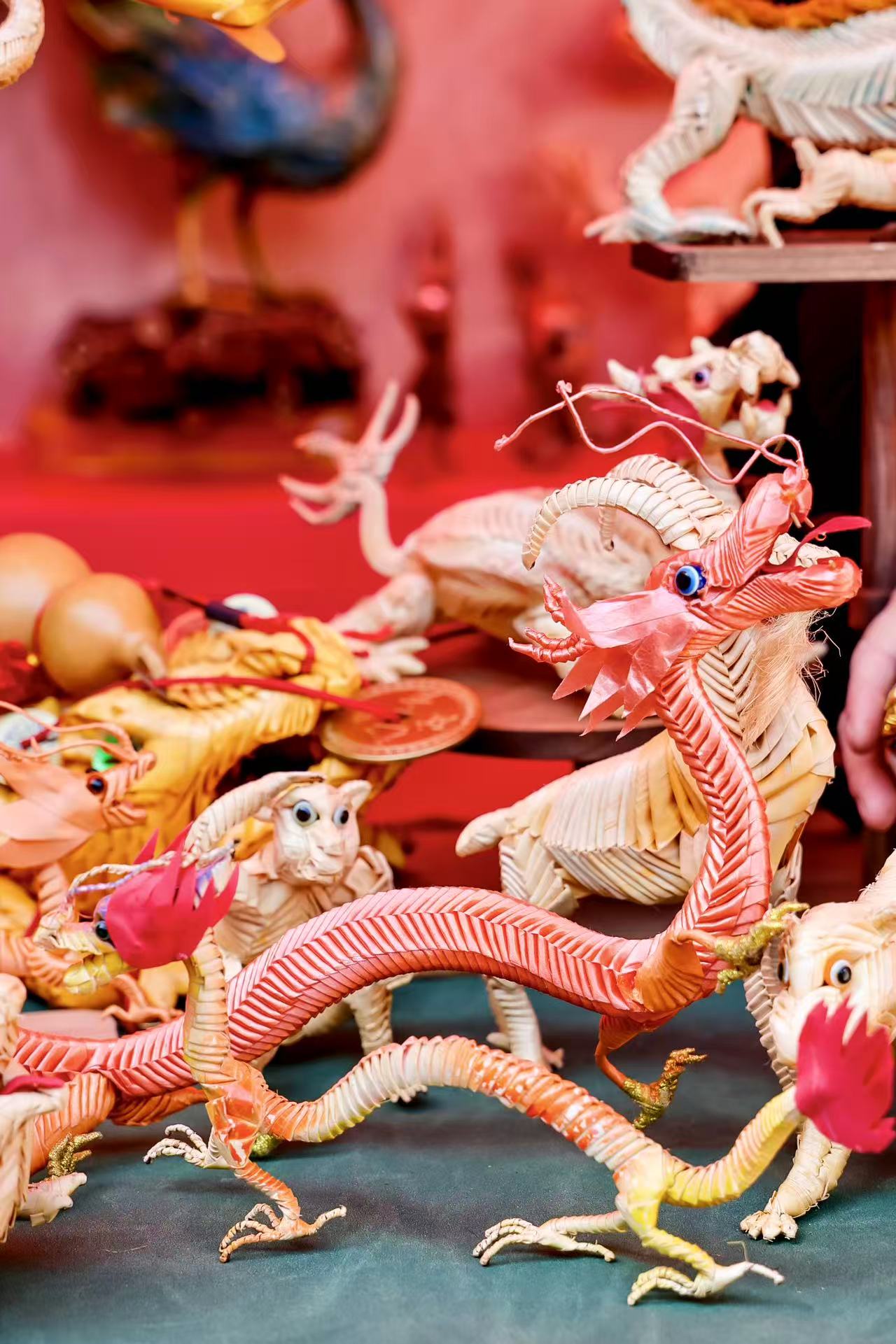 “所有的造型中,尤以中国龙的造型备受大众喜爱。龙的头部、躯干、四肢以及尾巴,每一部分都各有特色,需要我们徒手用铁丝为其捏出筋骨。一边捏筋骨,一边覆上棕叶,紧紧缠绕,渐渐编织出完整的龙身。”王玉霞告诉劳动报记者,简单的作品仅以棕叶进行制作,而复杂的物件就需要使用到铁丝,但同样不需要使用一滴胶水,都是“手上功夫”。