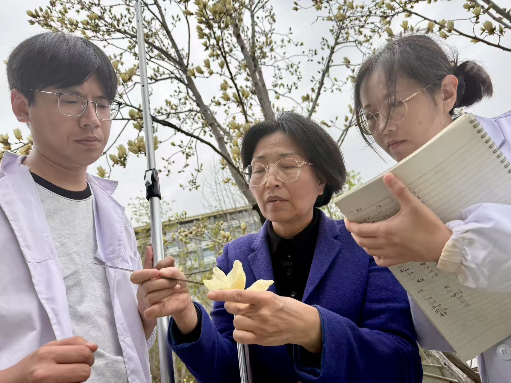 团队一遍一遍地讨论方案,一遍一遍地推演可能出现的问题。同时联合河南、崇明的基地,远程指挥工人做预实验。后来终于能进基地了,大棚里的温度已经飙到45度。试验树木的叶片被灼伤、脱落,一片焦黄。张冬梅看着那些蔫头耷脑的树,心里直打鼓:这样的白玉兰,还能二次开花吗?
