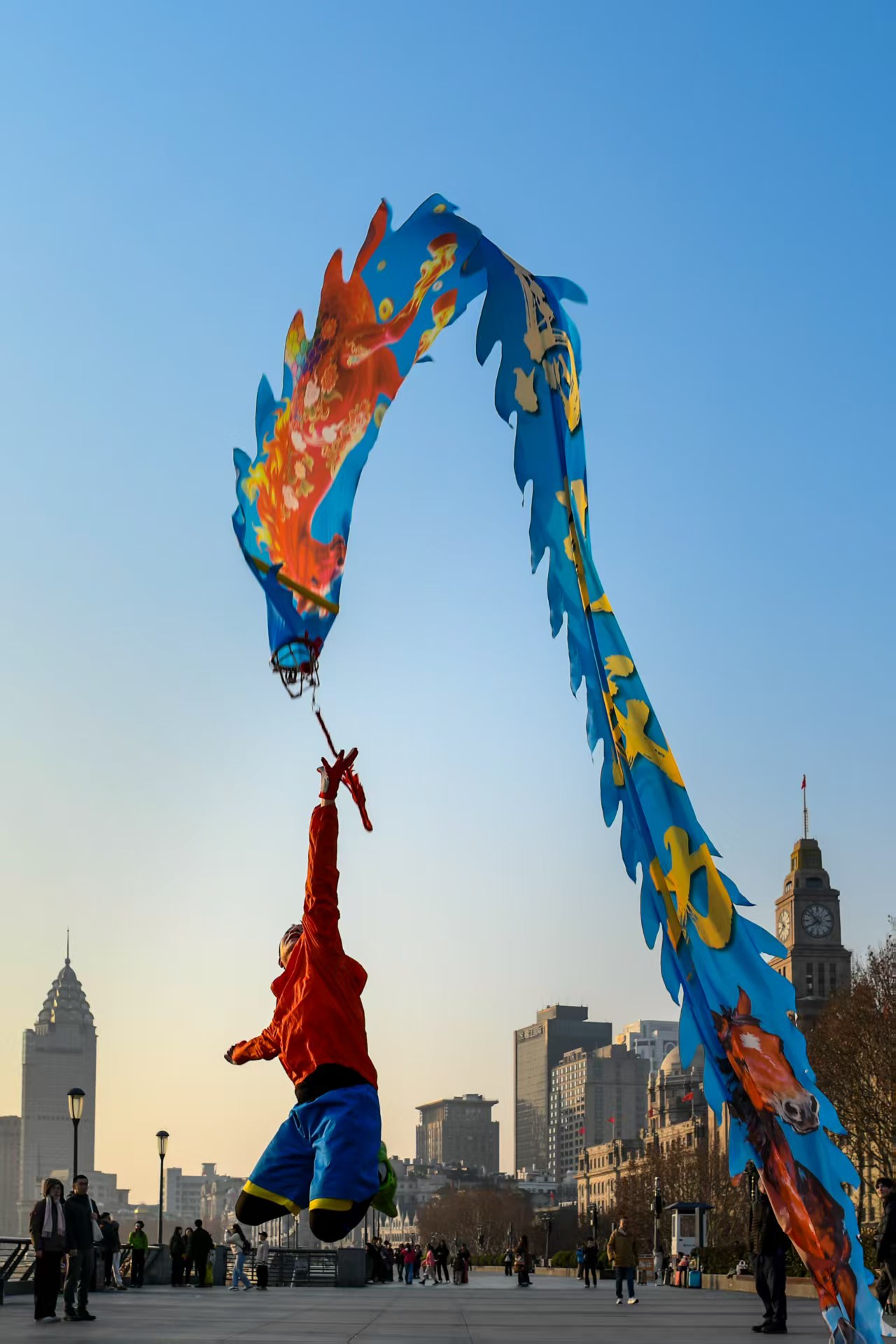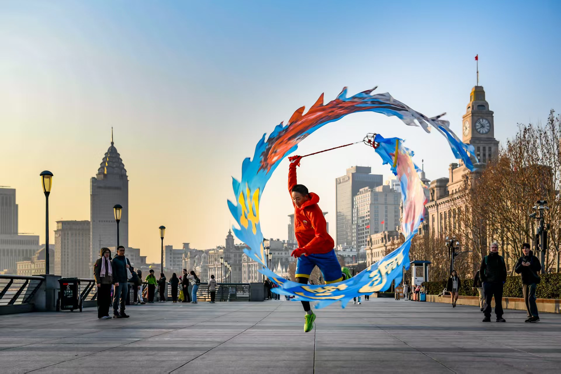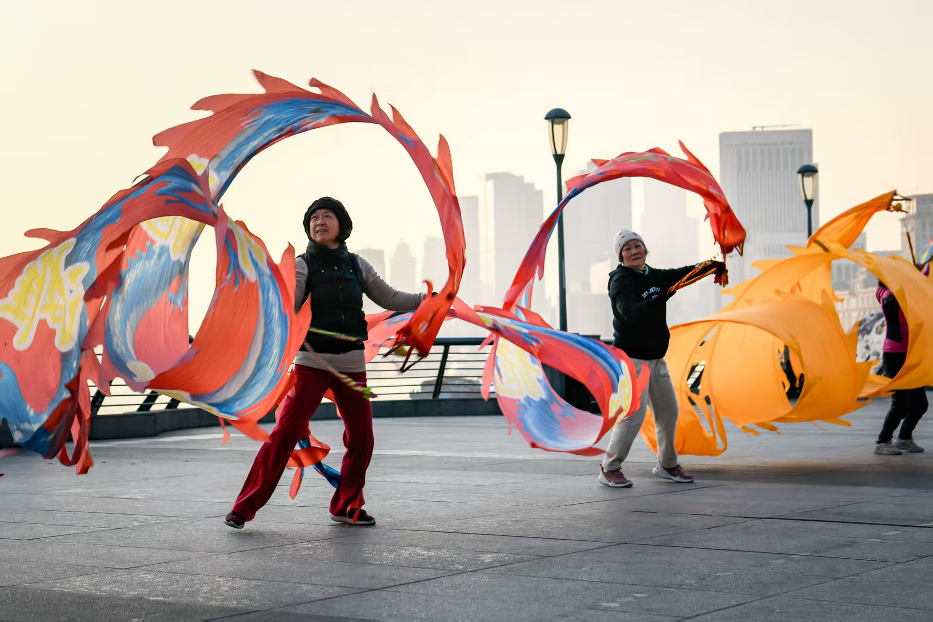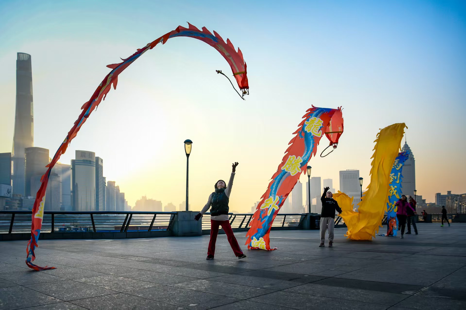 伴着晨曦,龙腾外滩舞龙队的阿姨爷叔们总会准时来到外滩观景平台晨练。在“陆家嘴三件套”轮廓的衬托下,他们手中的绸缎龙身在跳跃抛接之间,舞得活灵活现。