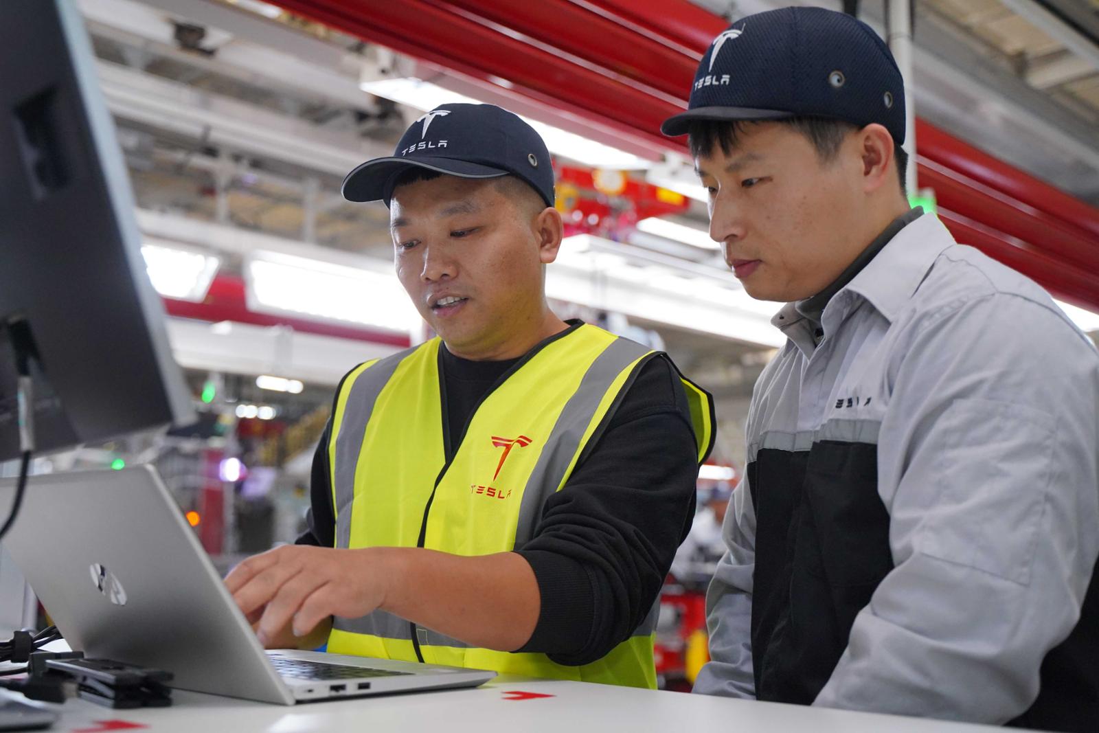 图为胡超与黄小龙在交流心得。特斯拉提供。