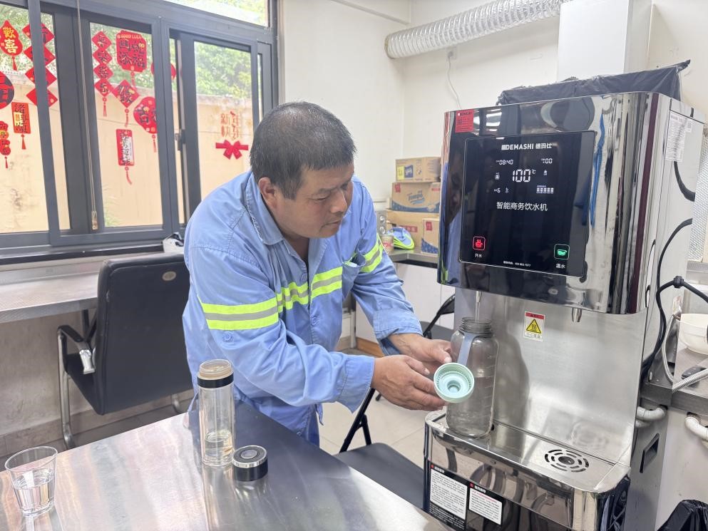 基础保障的“细节升级”同样暖心。西联公司为环卫工休息室添置了智能饮水器与空气净化器,解决喝水难与扬尘问题;百康电子元件公司休息室为职工定制专属水杯;柯马工程休息室配备了大屏电视,让职工休息时也能学习知识。