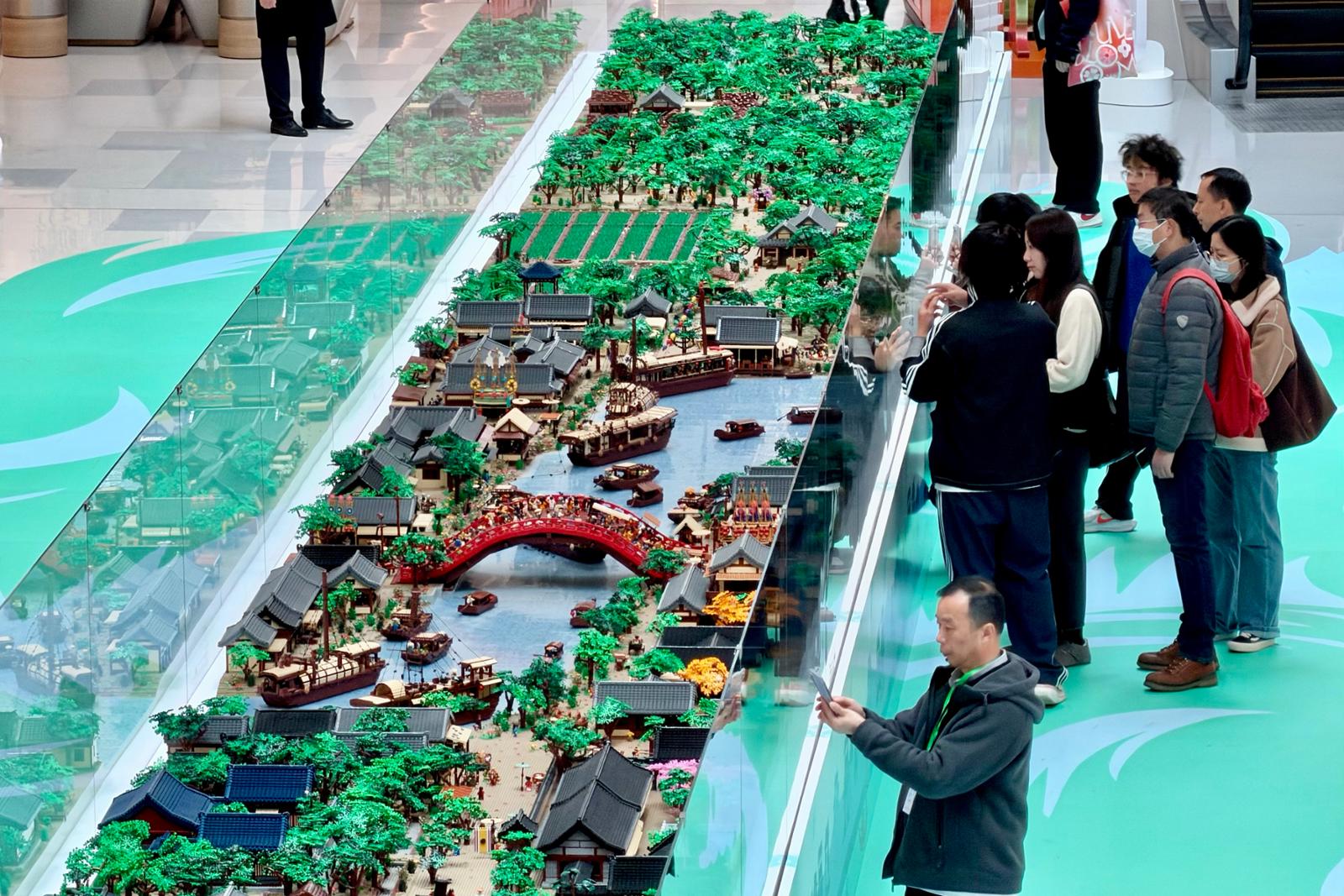 全长26.5米、宽1.8米的乐高实景装置《清明上河图》亮相上海,这也是全球最大的乐高立体情景模型,吸引不少市民争相打卡拍照。劳动报记者贡俊祺 摄影