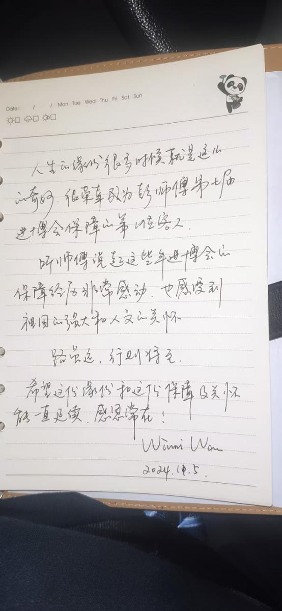 据悉,在今年进博会首日,一位展商乘坐了司机彭广兵的车,听了彭师傅讲述这些年服务进博会的经历,非常感动,她随即在笔记本上写下了几行字,“路虽远,行将则至。希望这份缘份和这份保障及关怀能一直延续,感恩常在!”