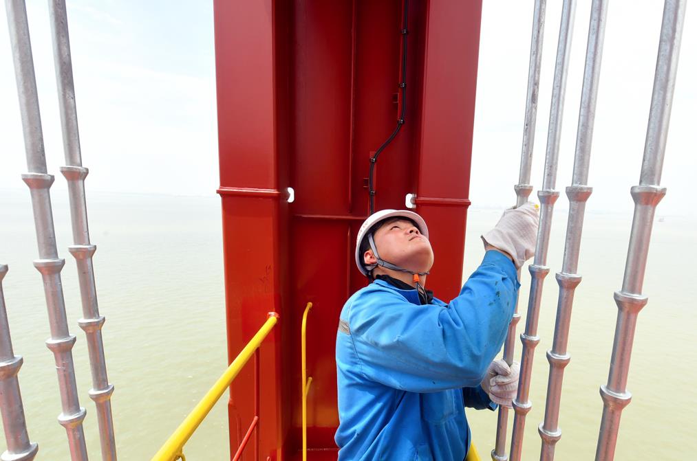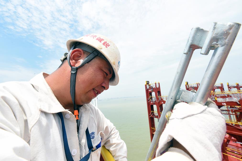 按照分工,张少龙和其他工友在导槽架上安装绑扎件,施俊琪负责在甲板上监护,为他们的安全保驾护航。导槽架上,一层层仅容一人通过的作业台宛如一个五线谱,张少龙和工友们分散在各个平台作业,如同散落在乐谱上的“音符”。“这些像回形针一样的银白色杆子就是绑扎件,每一根绑扎件的重量至少都有三四十斤,我们要将它们一根根精准插进卡槽,并且调整好长度和角度,固定在如同门把手一般的钩子里。”张少龙一边拧紧绑扎件,一边对记者说,他们五人一组,一个人一天要负责160件绑扎件的安装工作。可事实上,他和工友们一天中绑扎件的拿起次数,远远超过160次。“绑扎件都是成捆吊装至顶层平台,再通过上下相通的孔洞,由人工一层层接力传送下去。一天下来,天热根本算不上什么,手臂酸痛才是真正让人难受的。”