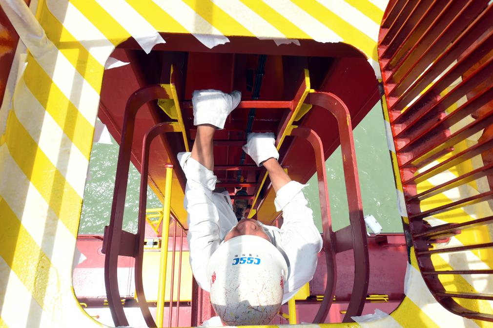 记者粗略估计,加上船体的高度,导槽架顶端距离地面有五六十米。凭栏而立,耳边不时传来呼呼的风声。“大家一开始上来都会有点恐高。”王须成说,“克服恐高没有别的办法,只有慢慢适应。今天在第一层工作,过几天适应了再上第二层,循序渐进。”自2007年进入中国船舶江南造船工作以来,王须成干过铁舾、分段等多个工种,最后却选择了这个“离太阳最近”的工作,一干就是十几年。“也说不上什么理由,我很喜欢这个能够俯瞰‘滚滚长江东入海’的工作。特别是夜幕降临之时,只要能见度高,就能在‘海上看上海’,欣赏江对岸华灯初上的美景。”