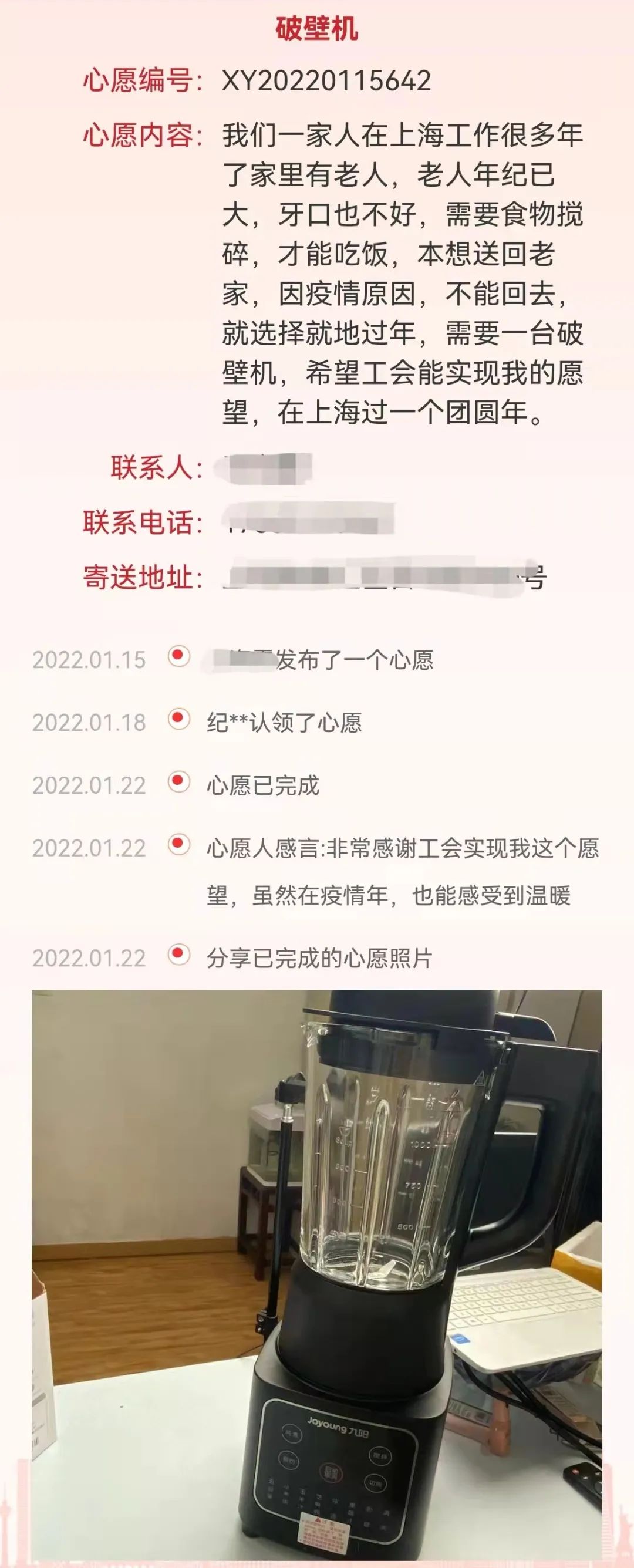 刚工作不久的年轻职工渴望一条厚实的冬季床褥度过寒冬;车祸后卧床数月的外来务工者想要一台微波炉吃上热饭;在沪打工多年的一家人想给牙口不好的老人买一台破壁机,方便搅拌吞咽……
