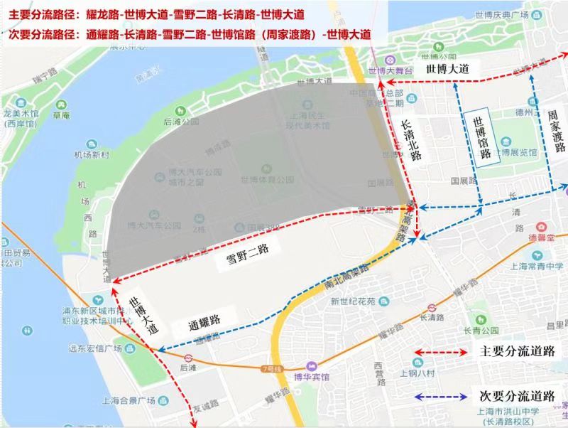 ◎原途经世博大道由东向西前往耀龙路(耀江路)方向的车辆,绕行线路如下: